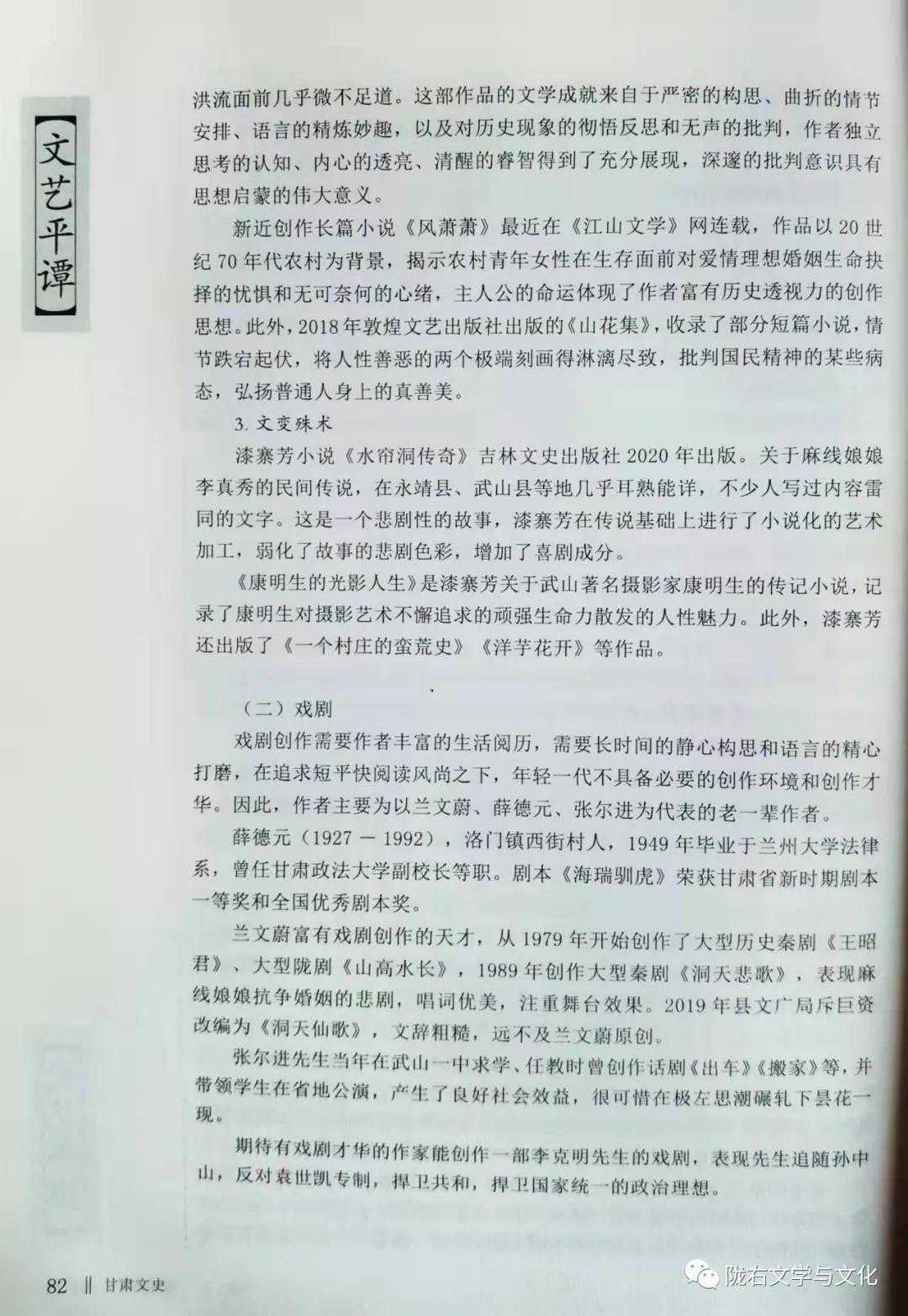 3.文变殊术漆寨芳小说《水帘洞传奇》吉林文史出版社2020年出版。关于麻线娘娘李真秀的民间传说,在永靖县、武山县等地几乎耳熟能详,不少人写过内容雷同的文字。这是一个悲剧性的故事,漆寨芳在传说基础上进行了小说化的艺术加工,弱化了故事的悲剧色彩,增加了喜剧成分。《康明生的光影人生》是漆寨芳关于武山著名摄影家康明生的传记小说,记录了康明生对摄影艺术不懈追求的顽强生命力散发的人性魅力。此外,漆寨芳还出版了《一个村庄的蛮荒史》《洋芋花开》等作品。
