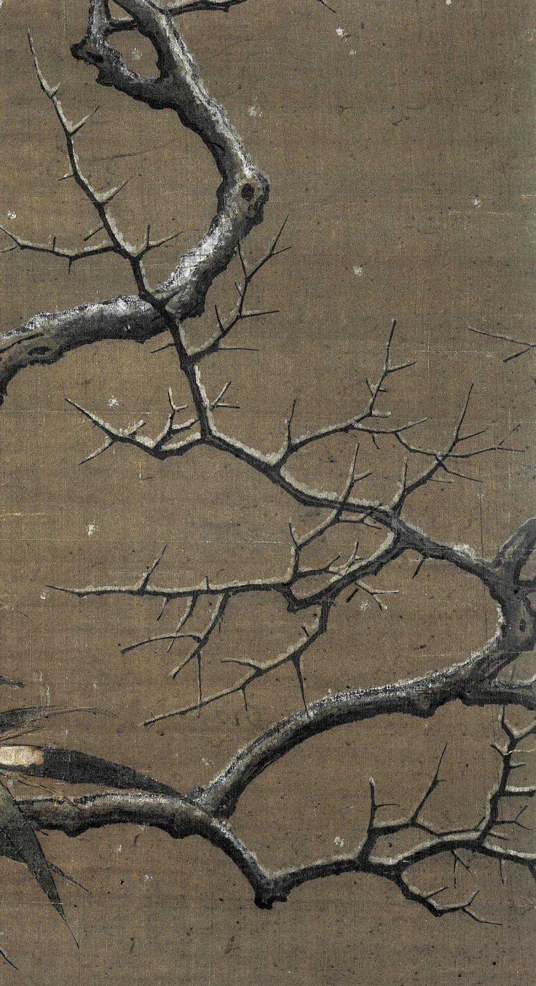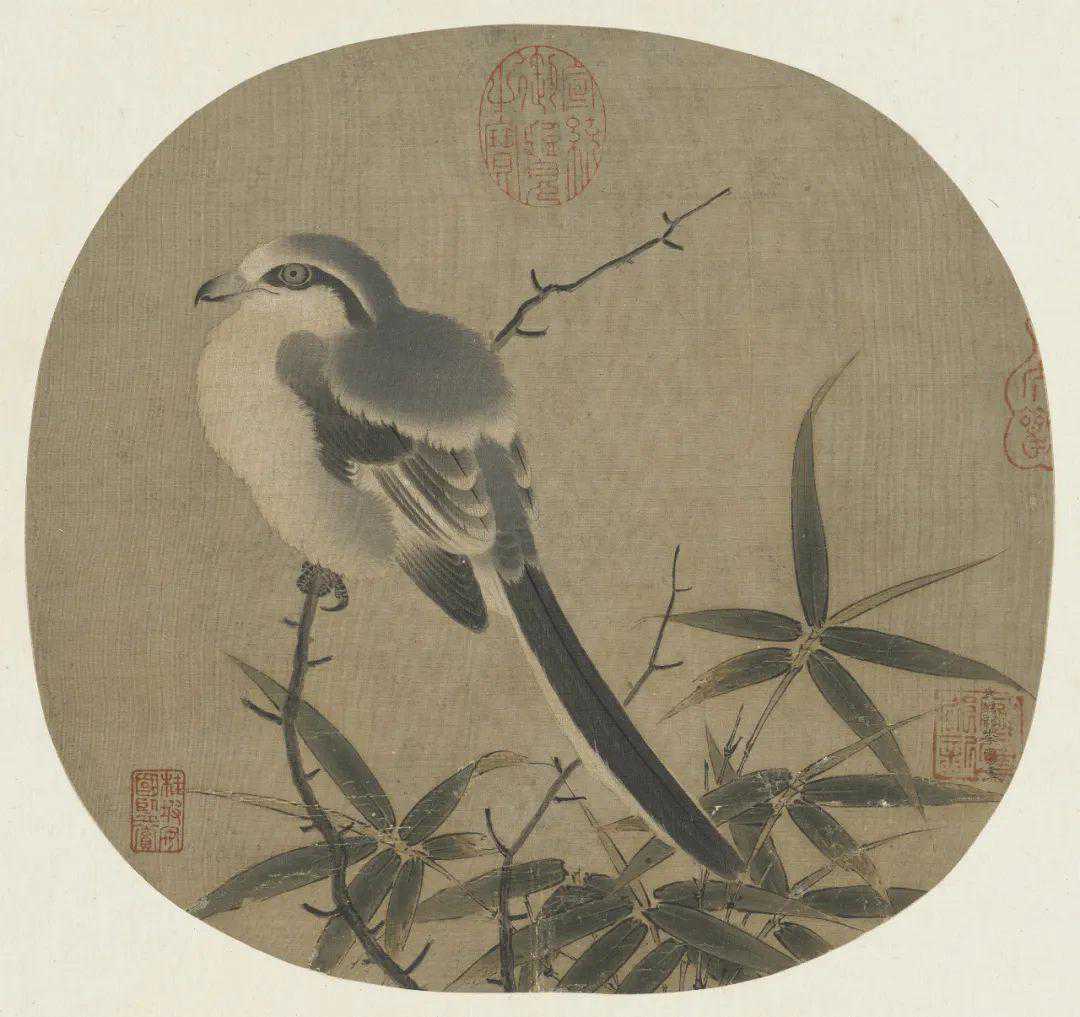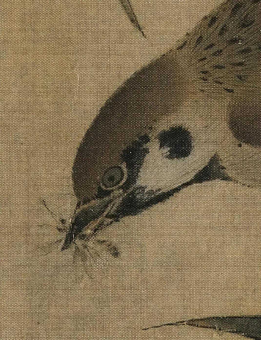 此图并未叙事,灰伯劳就这么安安静静地卧在荆棘枝上做一只美鸟,描绘精妙写实而不呆板,生气十足。枝柯坚实有力,用笔提按有致。弹雪的火候也把控得恰好,气氛轻盈而不做作。