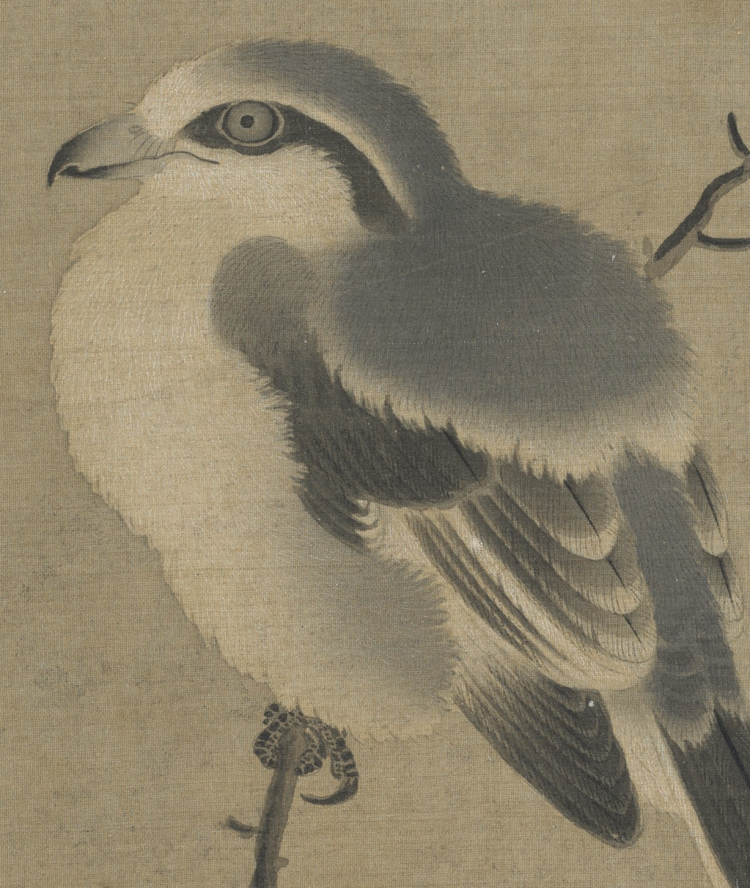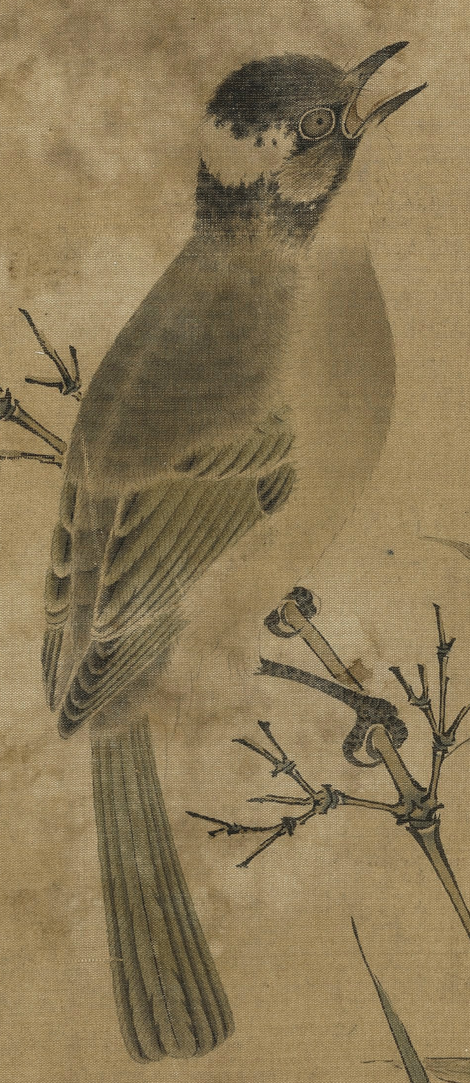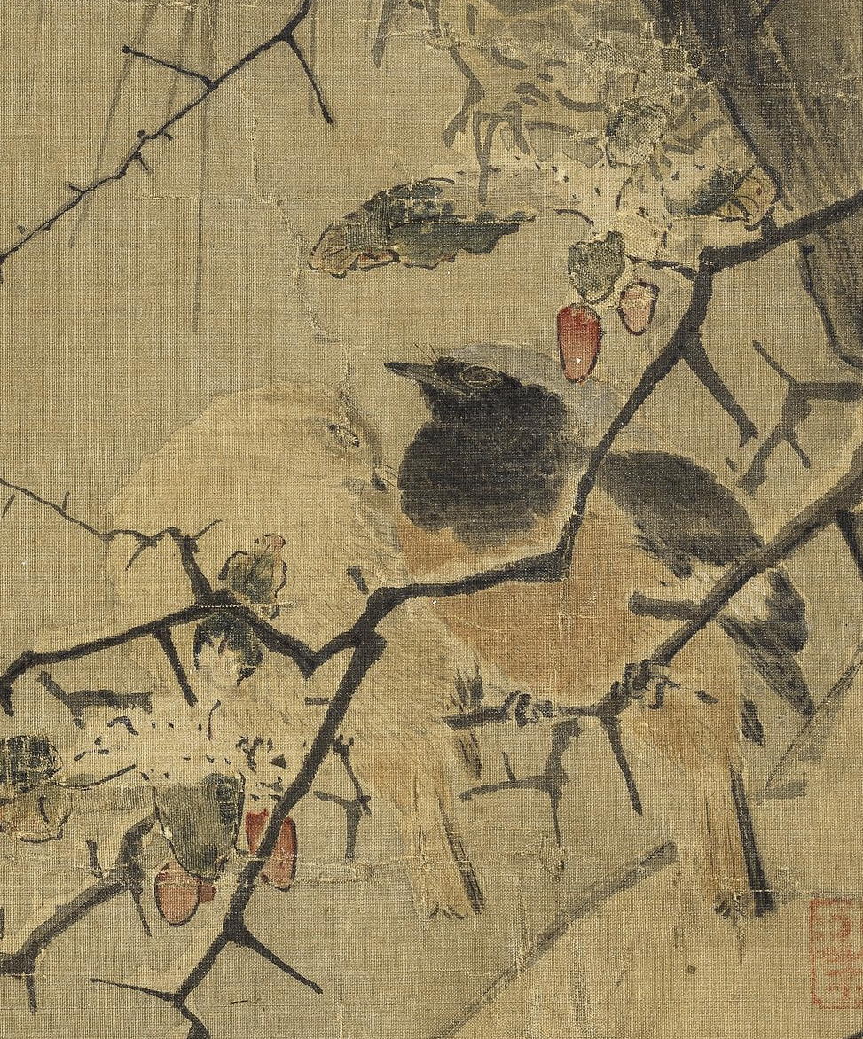 此图并未叙事,灰伯劳就这么安安静静地卧在荆棘枝上做一只美鸟,描绘精妙写实而不呆板,生气十足。枝柯坚实有力,用笔提按有致。弹雪的火候也把控得恰好,气氛轻盈而不做作。
