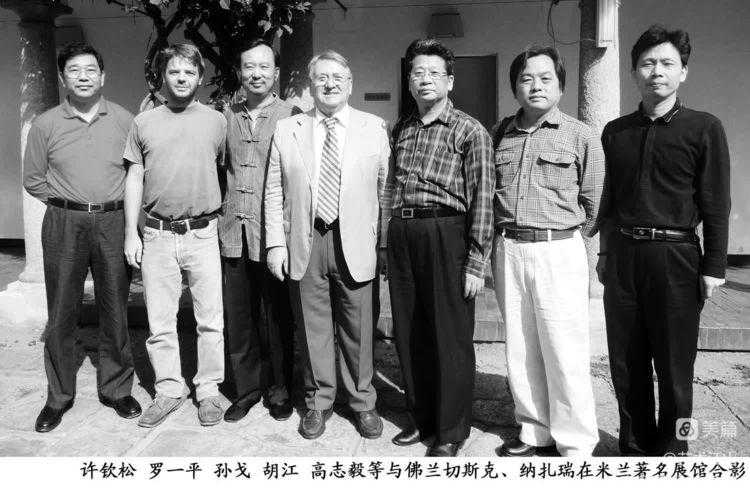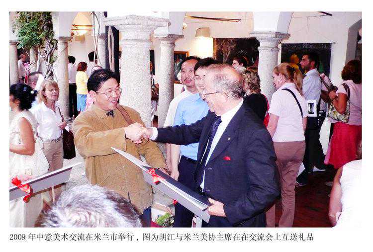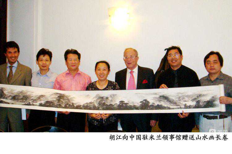 ▽2009年秋,中国画家许钦松、李荣海、罗一平、孙戈、胡江等应邀参加意大国际艺术大展。图为画家代表在意大利米兰向中国领事馆赠胡江国画山水长卷《江山叠翠图》。