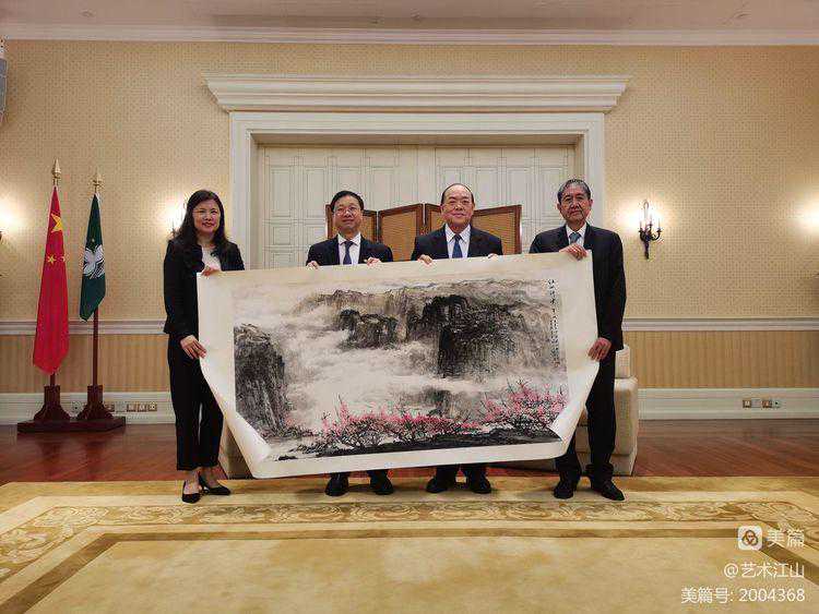 ▽2019年暨南大学宋献宗校长、洪岸副校长梁燕处长等向澳门时任特首贺一诚先生赠送国画《江山祥云》,寄意江山永固,福梓澳门的美好祝恿。