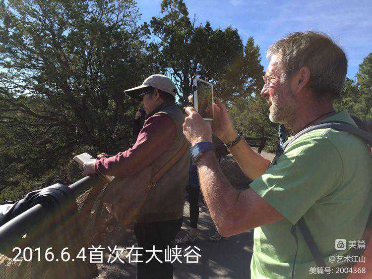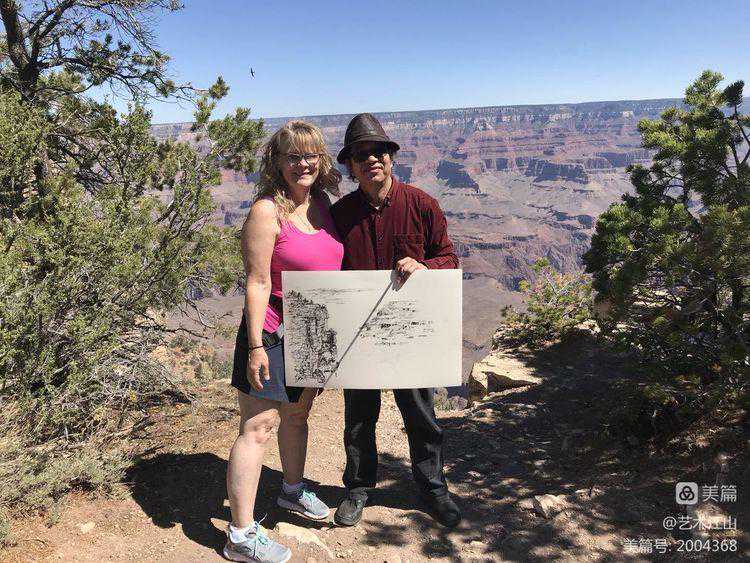 ▽2018年6月在美国大峡谷写生并与热心观众合影。