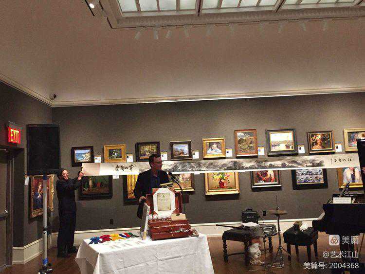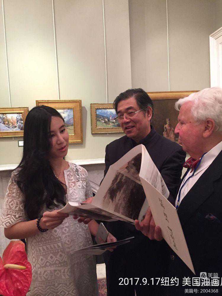 ▽2015年9月17日应时任美国油画协会主席肯.沃雷得(左一)的邀请,与家人崔少华、胡文安等到纽约参加美国油画年会。并在开幕式上向美国油画协会赠送国画《江山叠翠》的仿真作品。图1▽