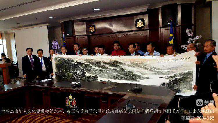 ▽2018年,全球杰出华人文化促进会组织代表团全体成员拜会马六甲州政府首席部长阿德里斯先生,并向阿德里斯部长赠送胡江教授创作的国画《江山万里图》。该作品为450x85cm,以水墨为主,描绘一派晨光初照、祥云飘渺、丰饶润泽、气势磅礴的大自然景象。寄意全球及马来西亚人民吉祥如意、和谐共荣的美好愿景。阿德里斯部长对全球杰出华人文化促进会赠予的厚礼表示由衷心的感谢并回赠了纪念礼品。