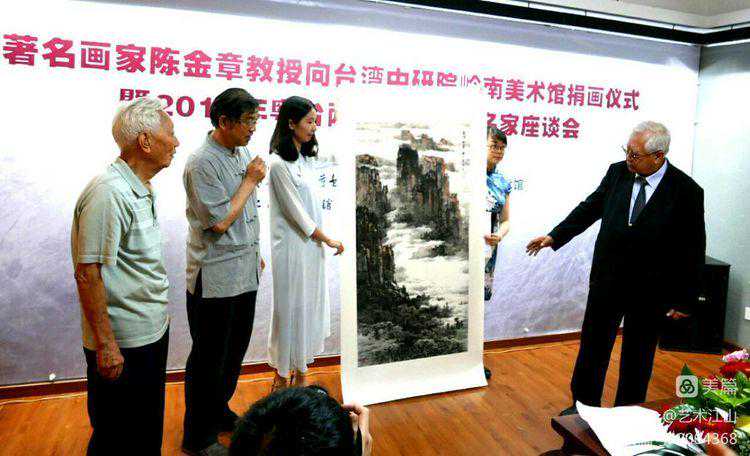 ▽2016年胡江先生向中国台湾岭南画派艺术馆捐赠作品现场(右为中国台湾岭南画派艺术馆名誉馆长、海外著名岭南画派领军人欧豪年先生,左为广州美术学院教授丶著名岭南画派领军人陈金章先生。)
