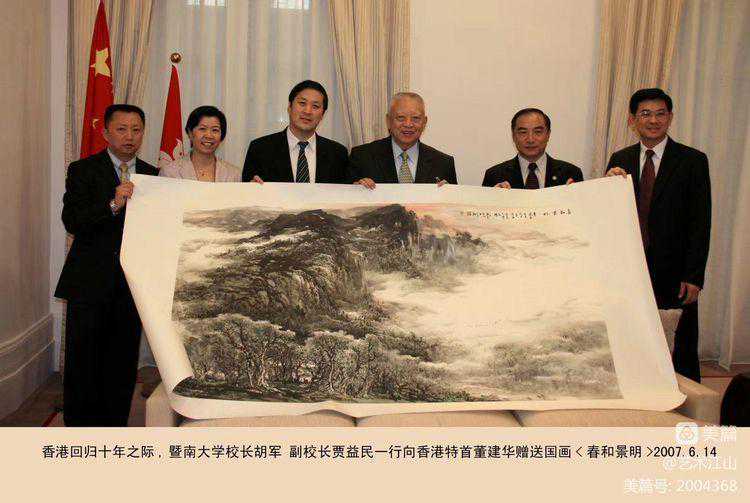 ▽2007年10月,百年侨校暨南大学向香港首任特首董建华先生赠送胡江教授创作的国画《春和景明》,寄意香港回归祖20年,平稳过度,形势喜人,春和景明。
