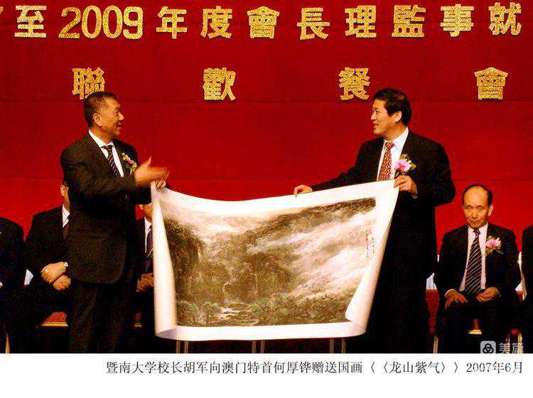 ▽2007年百年侨校暨南大学向澳门首任特首何厚铧先生赠送胡江教授的国画《龙山紫气》,寄情紫气东来,福梓澳门的祝福。
