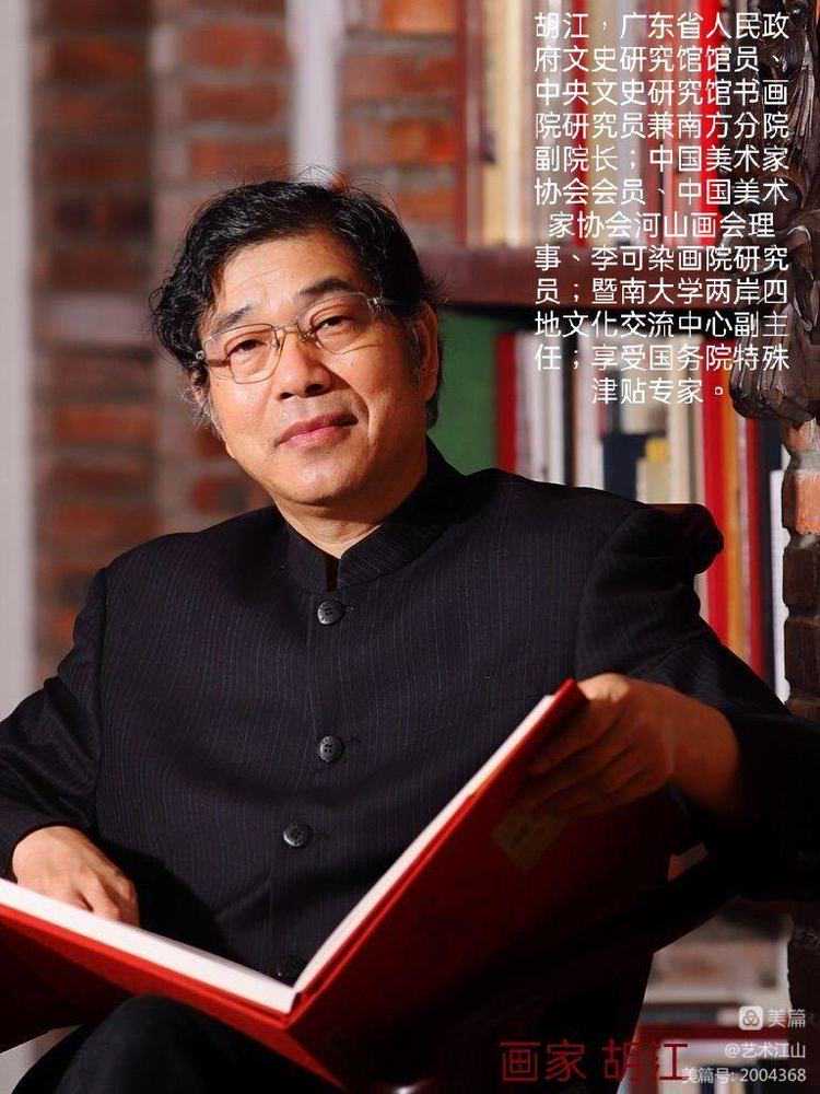 ▽胡江,现为广东省人民政府文史研究馆馆员、广东省人民政府文史研究馆艺术创作中心副主任、中国美术家协会会员、中国美术家协会河山画会会员,李可染画院研究员;广东岭南诗书画研究院执行院长;暨南大学兼职教授、暨南大学两岸四地文化交流中心副主任;享受国务院特殊津贴专家。