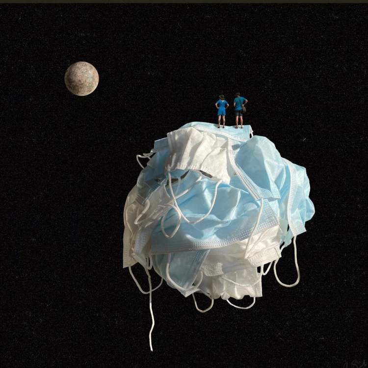 艺术家Raangul也曾用口罩做过精辟的隐喻——这些成堆的废弃物,正在覆盖我们的地球,支配我们的生活。