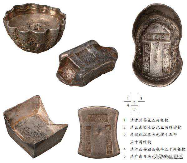 本世纪初,在新疆博尔地区发现了数十件蒙元时期的真定路河间盐税和平阳路征收课税所的五十两银锭。据考证是1230-1249年间河间盐场和平阳征收课税所征收的盐税银锭。1977年9月,吉林省农安县出土了两件蒙山岁课五十两银锭,其与上世纪90年代在内蒙古赤峰发现的一件湖北兴国路银矿税五十两银锭,都是山泽坑冶课税。至元三年(1266年),杨湜任诸路交钞都提举,请以平准库的白银铸成锭,重五十两,名曰“元宝”。至元十三年(1276年),蒙古军征服南宋后回到扬州,丞相伯颜下令搜刮将士行李,搜得的撒花银两铸成五十两重的银锭,并且在这种银锭的背面铸上“元宝”二字,锭面砸上“扬州”,这就是著名的“扬州元宝”,后进献给元世祖。民间铸造的银锭铭文简单,通常是店铺名、银匠名。目前发现以五两为多见,如“王开铺记”“真花银乐君茂铺”“朱君茂记”等。