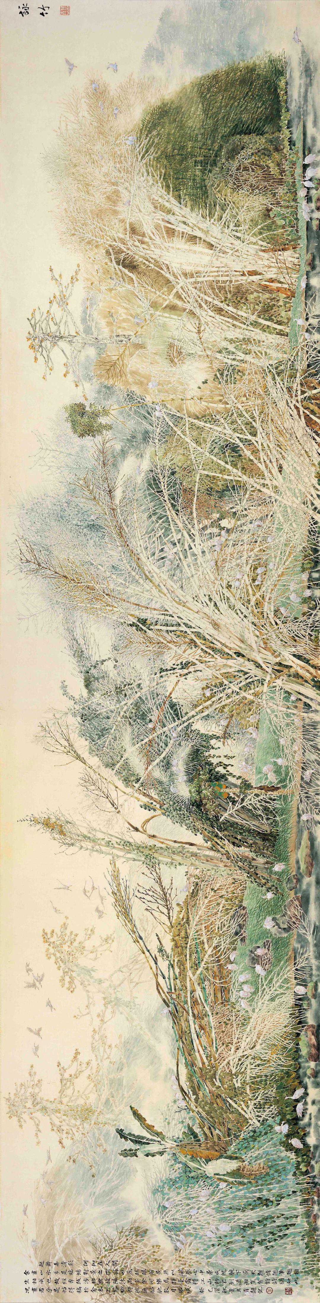 令人深受触动的是他在《咏竹》这幅作品展现的景色。画中是生长在沼泽边的一片金翠竹林,红棉、木瓜、野草交映,一群白色鹭鸶栖息其中,或飞翔长空,或行于草地,或停驻树上。一派天然情趣,正如画中所题,“起舞弄清影,何似在人间。”