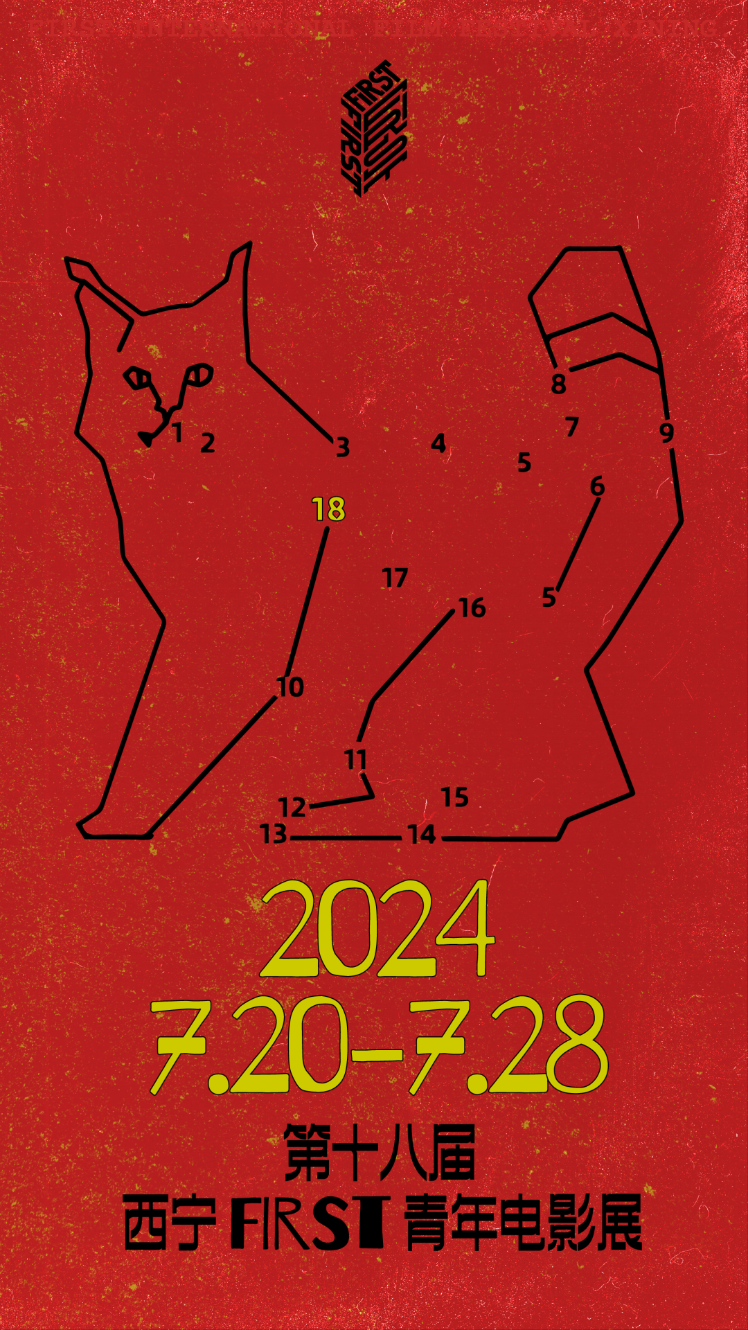 ↑第十八届FIRST青年电影展开年海报:边数数,边画画,专注而简单地描绘,想象力、思维力与审美力并行,形成的轮廓线中,荒漠猫的身影刹那间闪过。