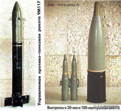 左侧为9M117炮射导弹右为30和100毫米炮弹