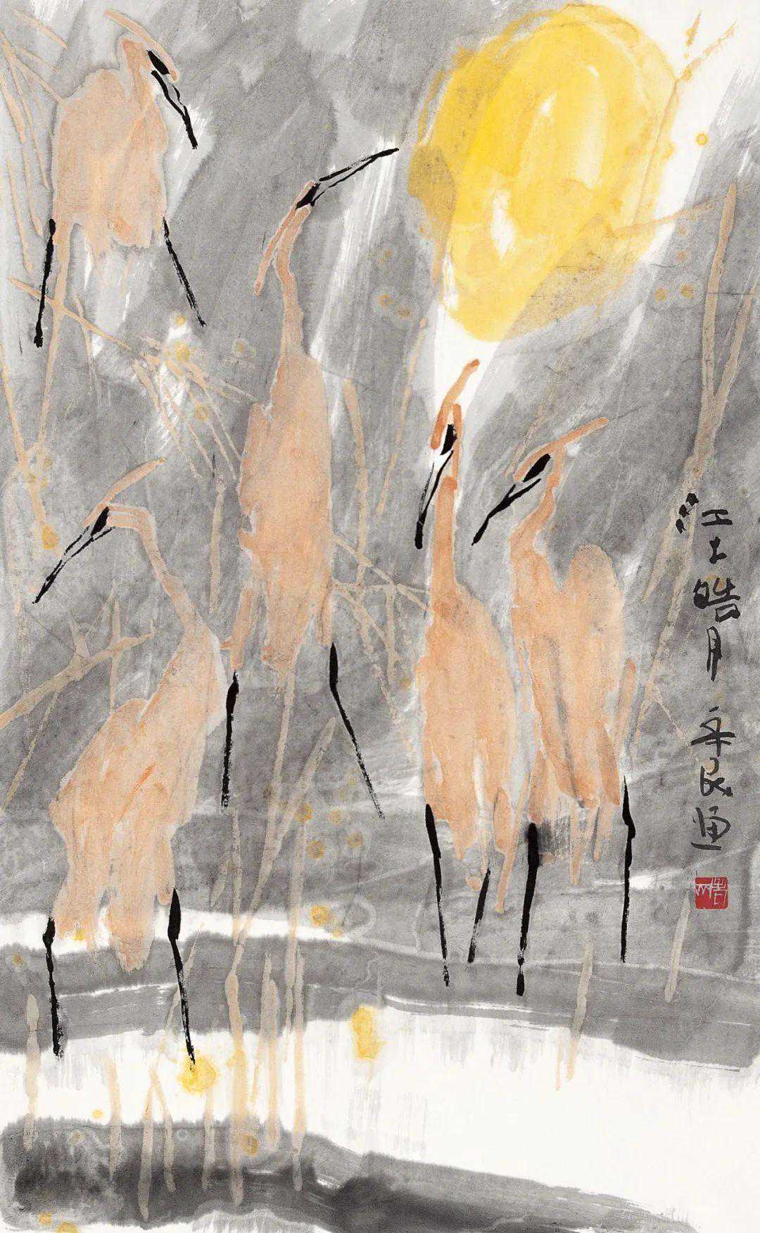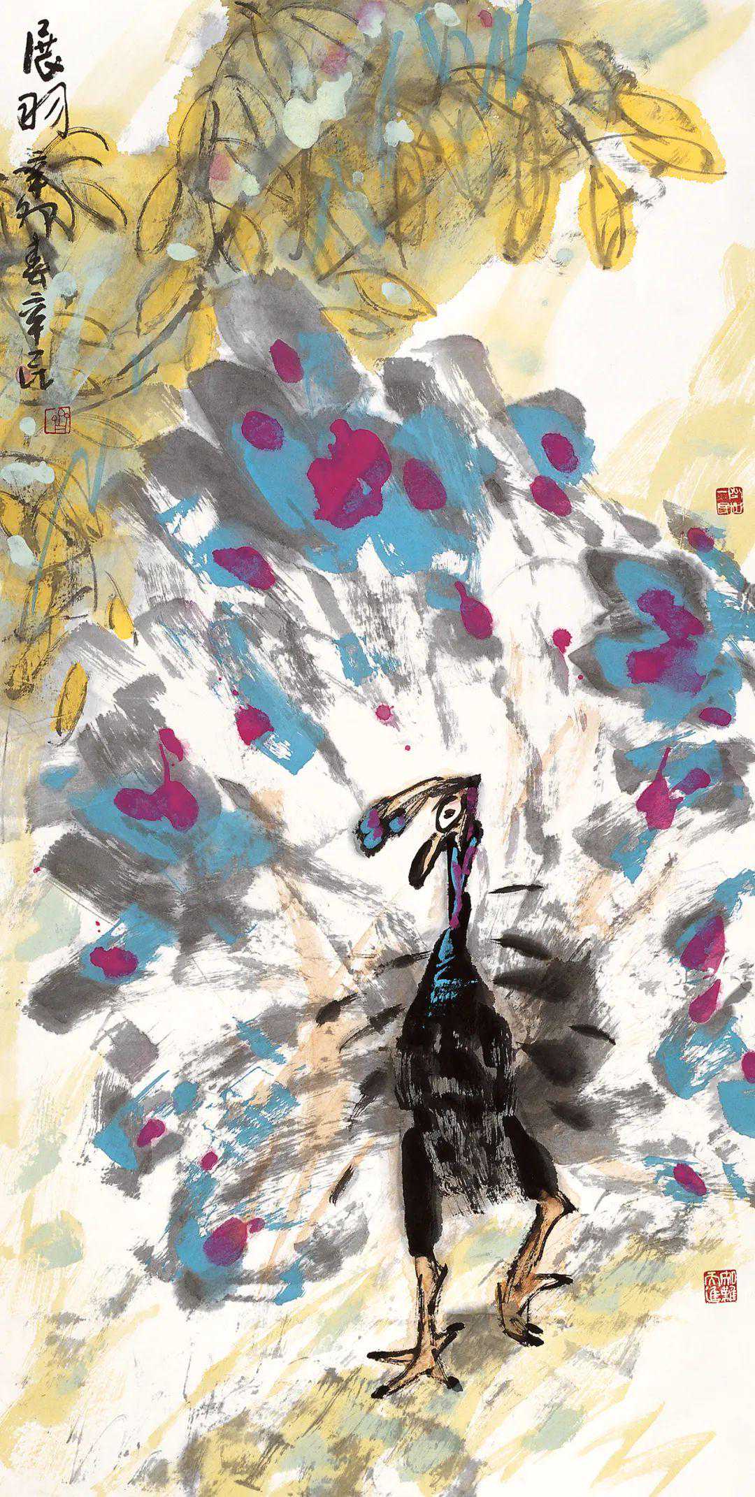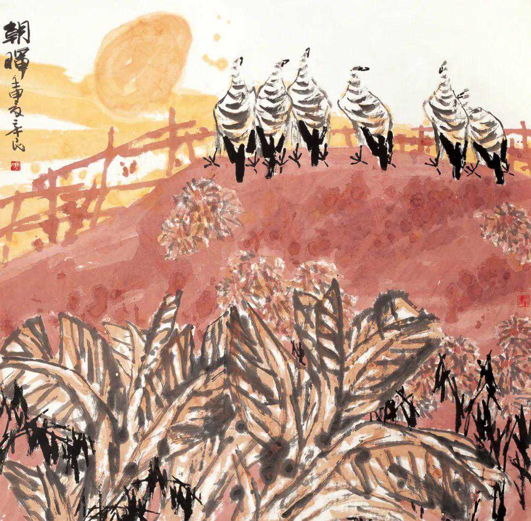 1992年,他参加中国美协全国首届花鸟画展览获得最高奖的作品《朝晖》,也体现出他在形式创造上的别具匠心。他把花卉景物和群鸟,都作了高度符号化的处理,在画面中反复铺排横向交叠的线条与块面,最终将视觉引向上方的曙光,具有震撼心灵的力量,在当时堪称是开启花鸟画形式表达新风的典范之作。