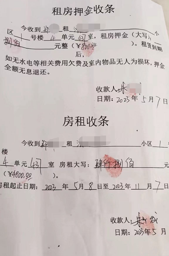 从曝光的信息可以得知,这位网友(郑先生)是去年5月7日租的房子,当时交了半年房租4800元,另外交了800元租房押金,收条上写着:“如无水电灯相关费用欠费及室内物品无人为损坏,押金全额无息退还。”