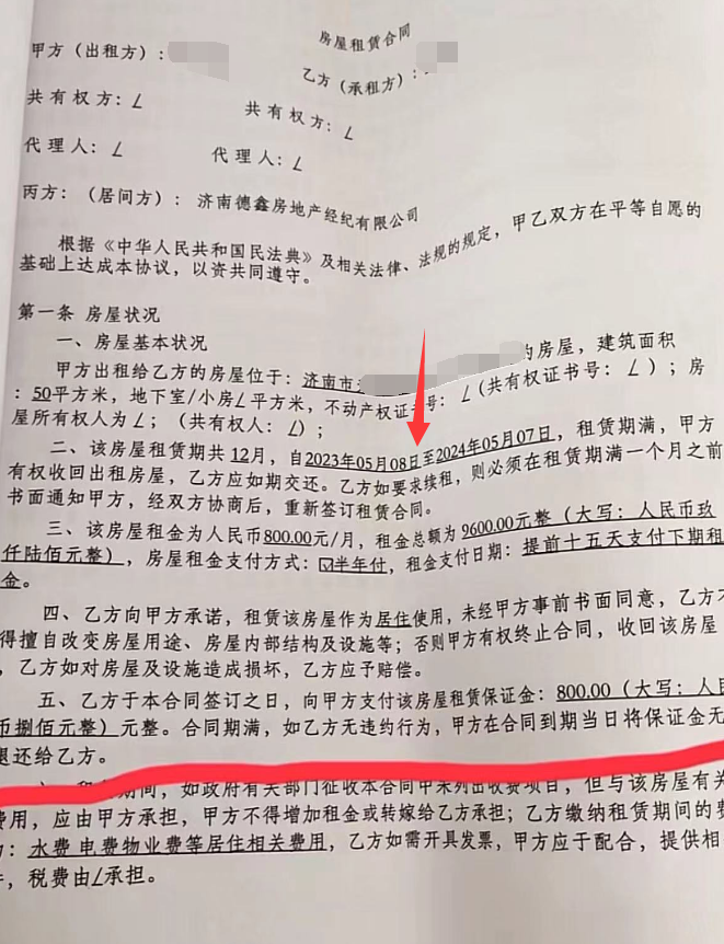 租赁合同上写着,郑先生租房到期时间是2024年5月7日(1年),该房屋租金为800元一个月(50平方米),支付方式为半年支付,合同期满,如乙方无违约行为,甲方应将保证金退还给乙方。