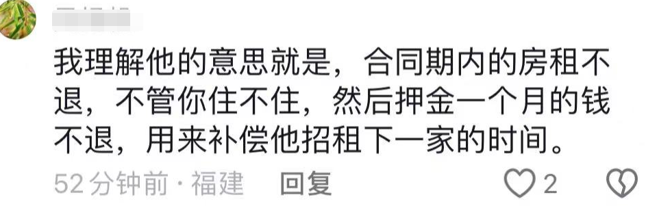 还有网友理解了房东意思,就是合同期内的房租不退,不管你住不住,然后押金一个月的钱不退,用来补偿他招租下一家的时间。