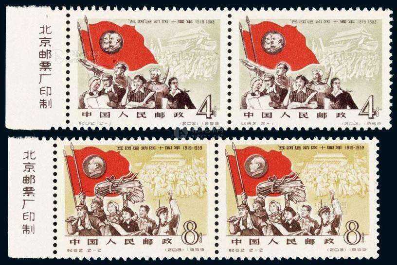 中华人民共和国成立以后,发行五四运动纪念邮票有3种形式。其中,专题纪念“五四”的邮票有三套。在1959年7月1日,中国邮政发行纪62《“五四”运动四十周年》纪念邮票1套2枚。面值分别为4分、8分。邮票主图为:高举马列主义旗帜“向科学技术进军”的人们和高举毛泽东思想的“工农商学兵”各界群众,背景为天安门及“五四”运动浮雕。