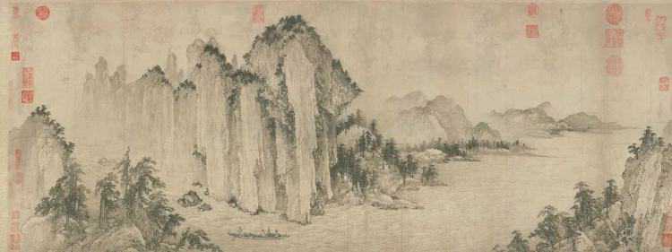 此图画法,直接以北宋北方画派的传统,用笔比较湿润,江水用流畅曲线,两出波纹,愈远愈细淡。近山用浓墨的斧劈皴,再加淡墨直皴,竖斜交织,表现了山石的质感。远山远树用淡墨画出,不点苔,略加皴染山石和树木,刚柔适中,立体感强,产生浓淡墨色的渗化现象。这种注重空气透视变化的画法,造就一卷颇具特色的作品。