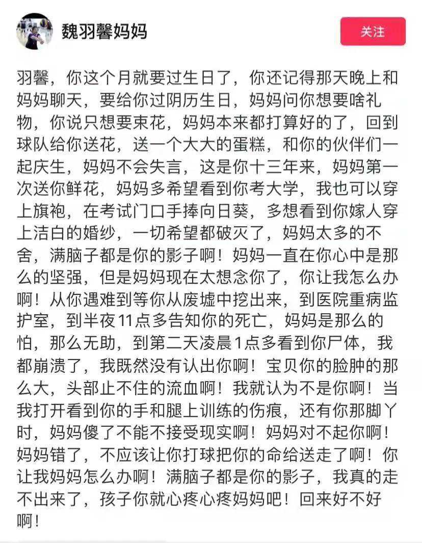 事情发生后,魏羽馨一家几乎不能接受这个消息,要知道仅仅再过十天便会迎来魏羽馨的生日,但这场无情的事故终究击毁了这个家庭平淡幸福的生活。