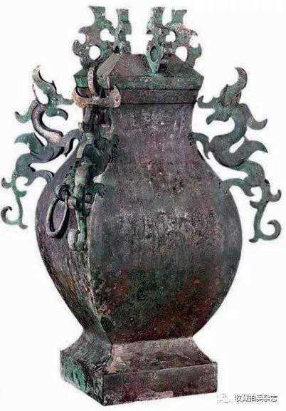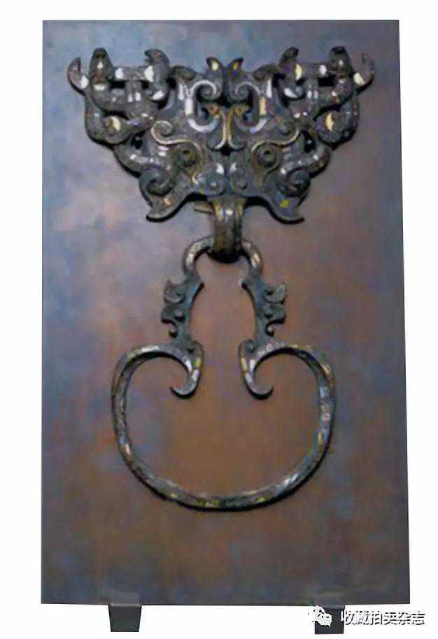 另一对堪称珍品的铺首,为著名华人收藏家虞坚先生收藏的战国错金银饕餮纹铺首。该铺首高达30厘米,是迄今为止发现的最大尺寸的天子寝宫专用的错金银大门铺首,此对铺首错金银工艺极为精细繁杂,是同类中的精工巨作。这对铺首1923年在山西浑源李峪出土后就被法国最大的古董商万聂科购回法国,家族递藏直至20世纪70年代转藏于欧洲名流贵族随入藏法国私人博物馆,后由虞坚斥资3000万元获得。这对铺首之所以稀缺,首先从工艺上看应为战国天子专用器,从造型风格分析极可能为晋国著名的国君重耳的王妃寝宫遗物,后来陪葬入土。即使是当年举世震惊的曾侯乙墓出土青铜器,最高级别的也只是出现了镏金工艺,因为当时曾侯乙只是诸侯王级别,规格所限无法用到错金银的工艺。