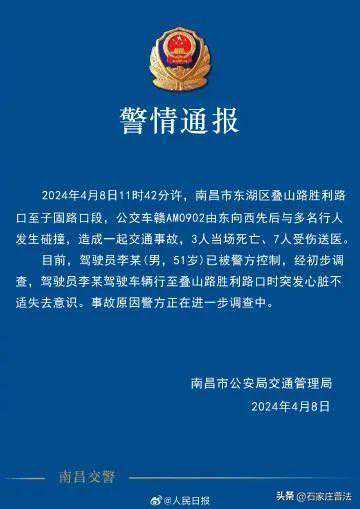 2、警方通报南昌交通事故致3死7伤8日,南昌警方通报,当日一辆公交车先后与多名行人发生碰撞,3人当场死亡、7人受伤送医。目前,51岁的驾驶员李某已被警方控制,经初步调查,李某驾驶车辆时突发心脏不适失去意识。事故原因警方正在进一步调查中。(@南昌交警)