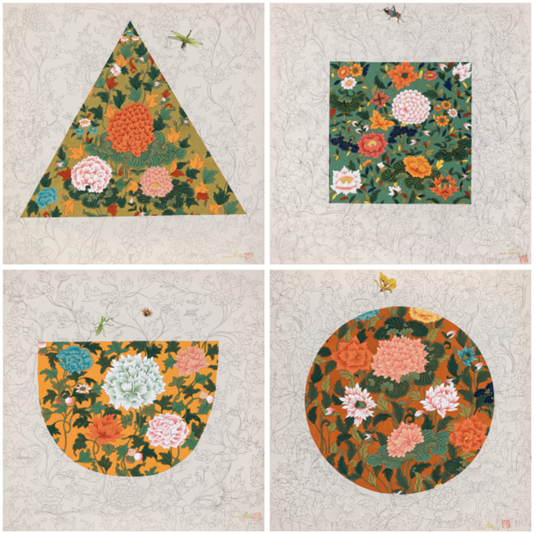 拉巴次仁唐卡花卉中国画70cm×70cm×4西藏