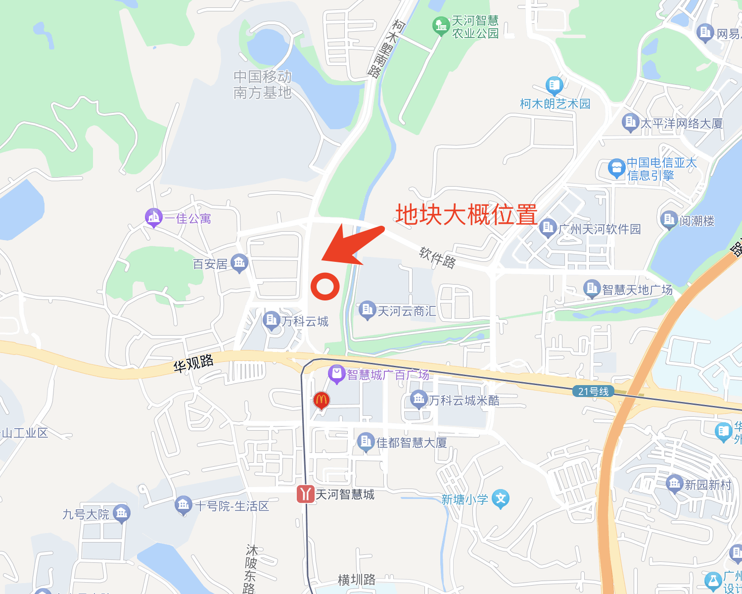 从地图来看,该地块位置较优越,周边配套成熟,紧邻万科云城、智慧城广百商场、万科云商汇、天河软件园。最近的地铁站为天河智慧城站。