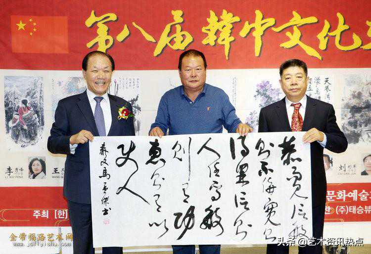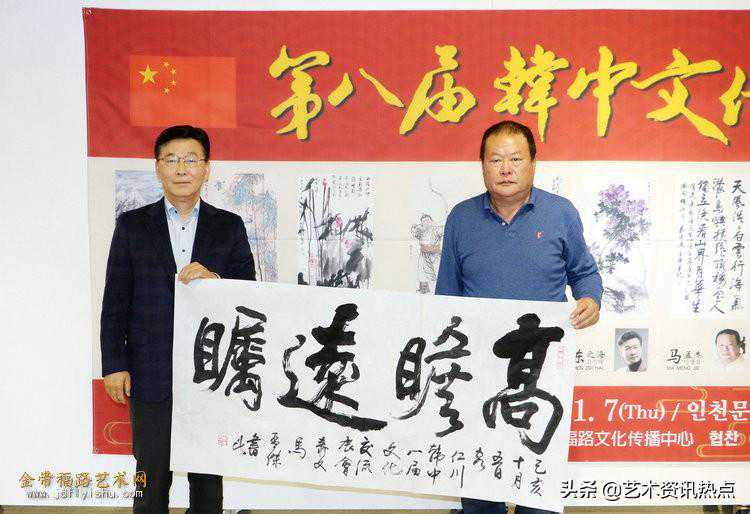 马孟杰在韩国“第八届中韩文化交流展”现场与韩国艺术家河永雨交流。