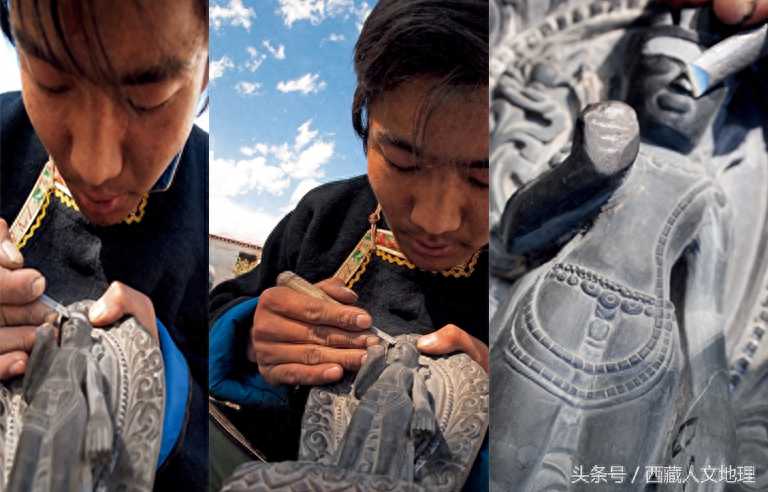 黑玉石雕刻过程非常繁杂,第一步是上山采石。这种石头质地精密、细腻透明,一般产于拉萨河中游北岸墨竹工卡县境内的帮堆乡,但是产量非常少,不容易找寻。一尊约莫20厘米高的佛像,需要4个月的时间才能完成。而最大的一尊约莫1.2米高的佛像,三个人差不多雕刻了一年才完成。细加工完成后,就用牦牛皮进行抛光,然后上油,有的还需要在佛像上镀一层金粉。最后一道工序是开光。(聚精会神工作的晋巴次旦撰文、摄影/索穷)