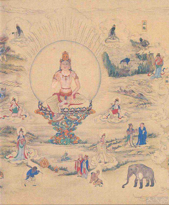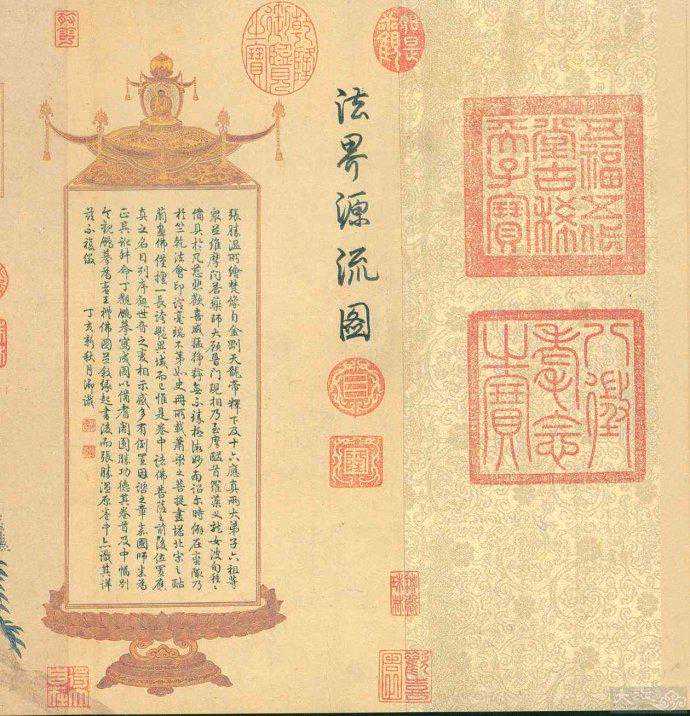 《法界源流图》堪称佛教图像学百科全书。图像细分九部分内容:1、护法天王与神龙八部;2、观世音;3、佛陀;4、菩萨与佛母;5、十八罗汉;6、禅宗六祖;7、药师琉璃光佛;8、护法神;9、帝释、梵王和舍利宝塔。