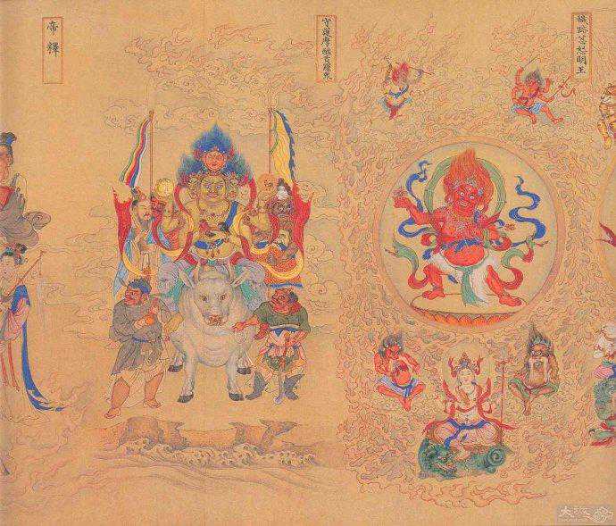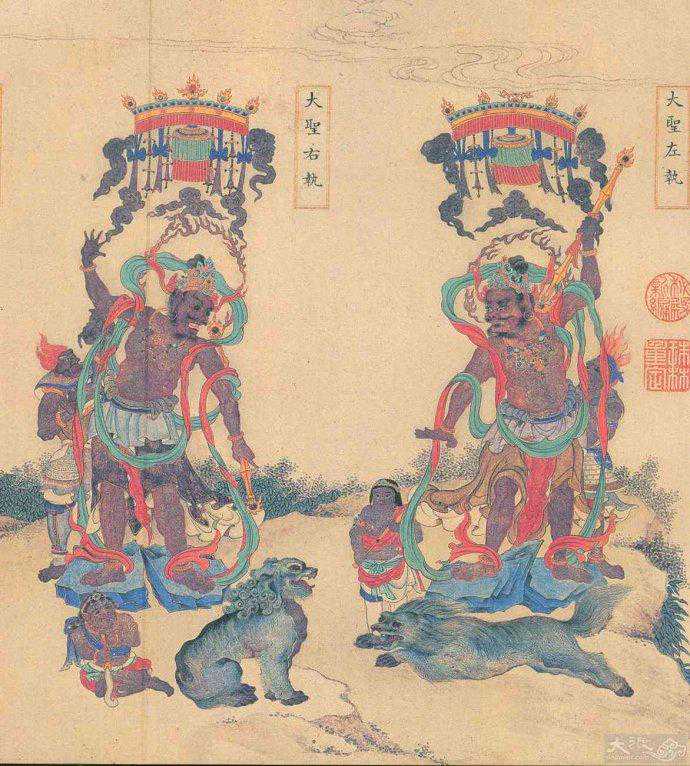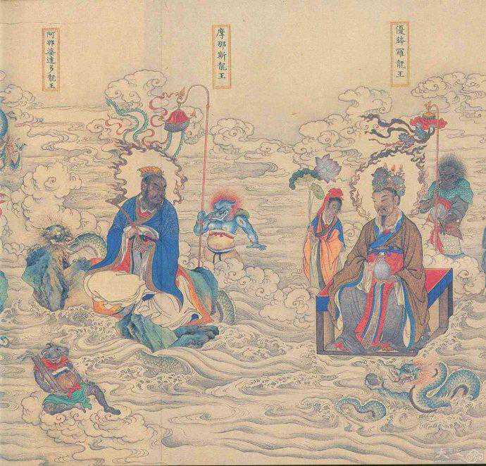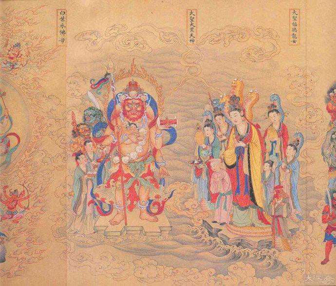 由大圣左执至阿那婆达多龙王共十一幅图,画的都是护持佛法诸天神。包括作金刚力士形象的两大护法天王——大圣左、右执及九位龙王,即佛经所谓“神龙八部”的八大龙王及手持金刚统领眷属的八部之首。
