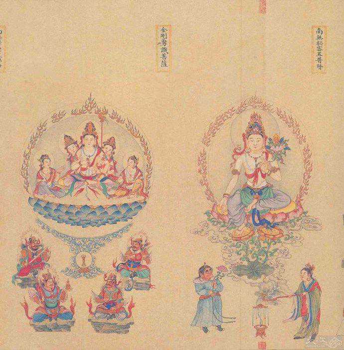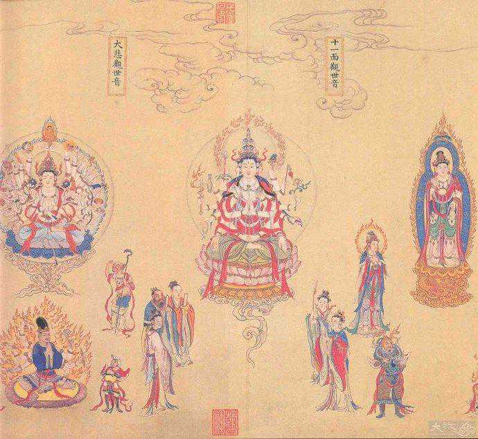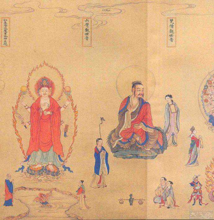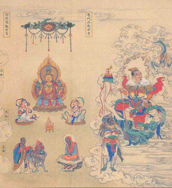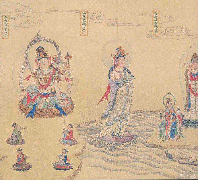 由普门品观世音至六臂观世音共十六幅图,画的都是观世音化身,即“普门现相”,比常见的观世音图像丰富很多。观世音菩萨乃是阿弥陀如来佛的侍从,协助佛进行教化,普度众生,身位仅次于佛。所画的观世音多作女相,袒裸上身,妙装美容,婀娜多姿,是画家着意描画的神祗,其中寻声救苦观世音和如意轮观世音的造型最为精彩。