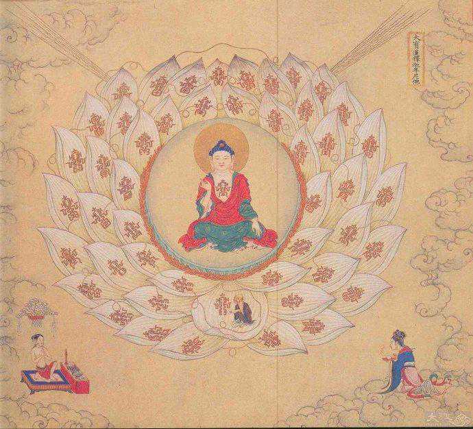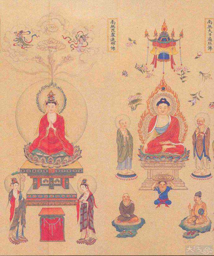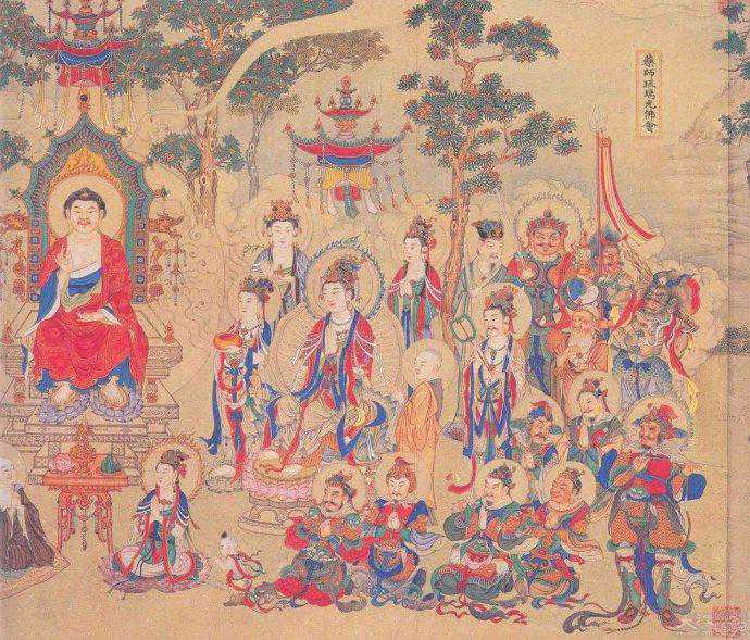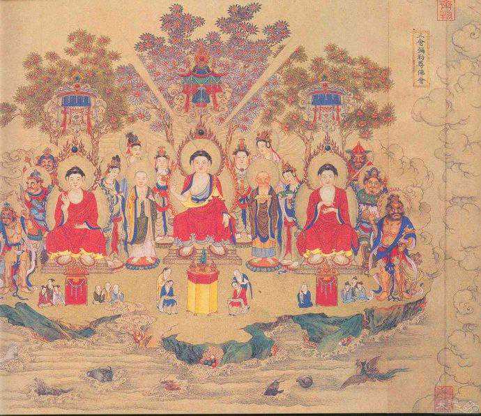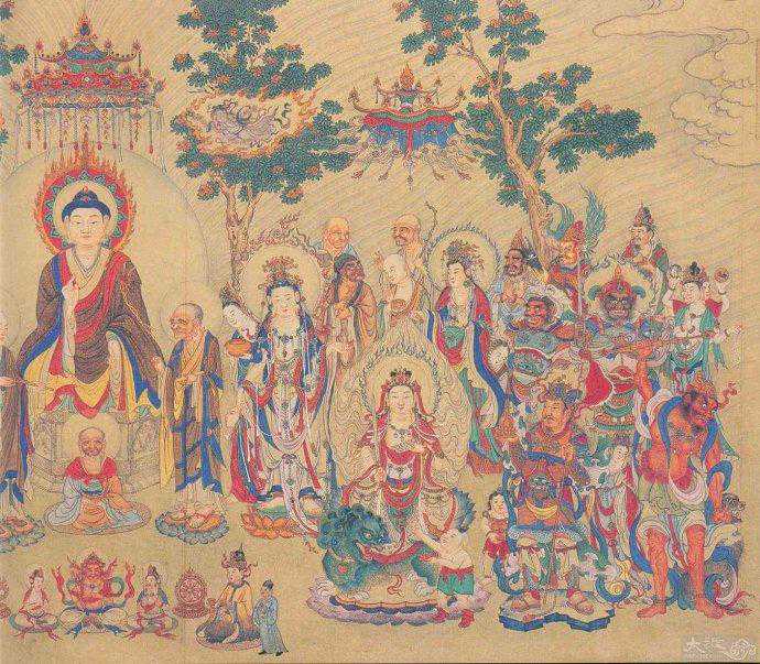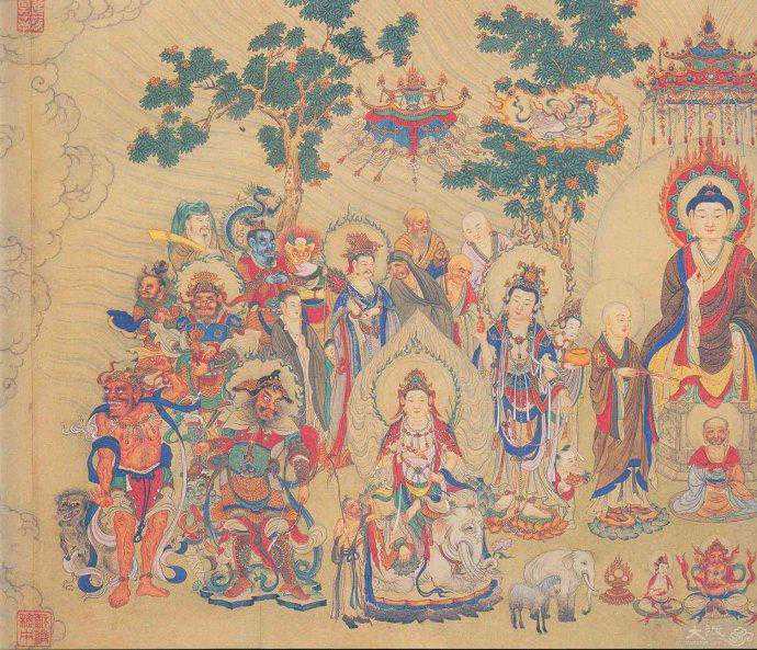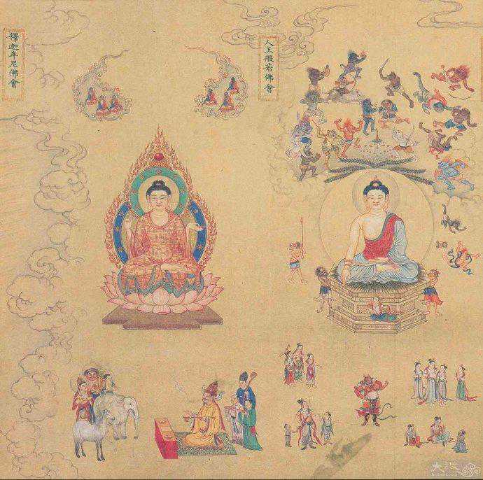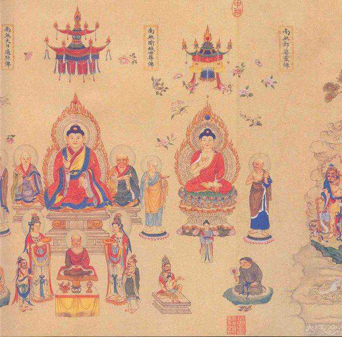 由如来降伏魔军地神至南无旎檀佛,画的都是释迦牟尼佛。从成佛之初到佛会说法,弥勒佛转世以至他各种应化形佛都一一描绘。这部分在本画卷起承上启下的作用。最引人入胜的是佛会群体像。在释迦牟尼佛会里,佛祖在四株结满金果的菩提树下,端坐在雕狮须弥座说法;上有华盖璎珞、飞天、弟子迦叶、阿难、菩萨文殊、普贤、观音、童子、罗汉、天王及金刚等五十余人护侍左右,还有白马、白象、明珠、玉女、藏臣、兵臣、法轮七宝、龙凤异兽和供养人(似是人间王者及侍女)等。场面宏大,庄严肃穆,佛光普照,光彩夺目,真是佛的缤纷世界。
