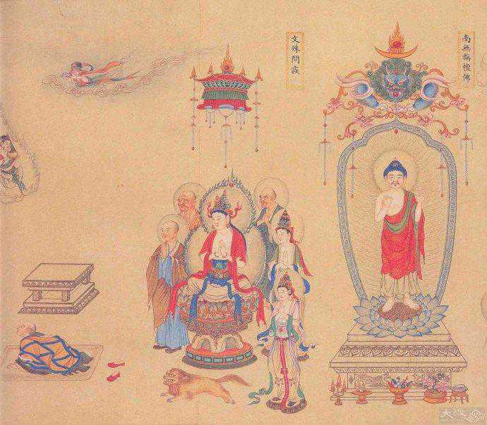 由文殊问疾至袔梨帝母众共十五幅画,画的是诸菩萨和佛母。在这些神像中,最吸引的是文殊问疾、维摩大士和袔梨帝母众三图。前二者合成一幅主题画,即文殊问疾与维摩诘居士辩论的故事,画家把主司智慧的文殊菩萨和能言善辩的维摩刻画得传神入微。至于袔梨帝母众,是印度佛教传说中掌管育子、安产和维护佛法的女神,原是吃小孩的恶魔形象,在画家笔下变成典型的中国贵夫人形象。在中式山水画屏风前面,所画的执扇侍女、怀抱婴儿的妇女、正在乳婴的妇女及玩耍的儿童,都充满中国情味及人间欢乐之情,是画家意念和理想的反映。