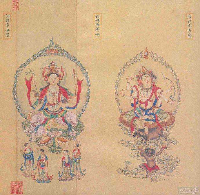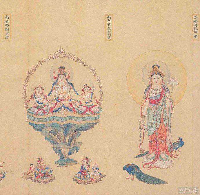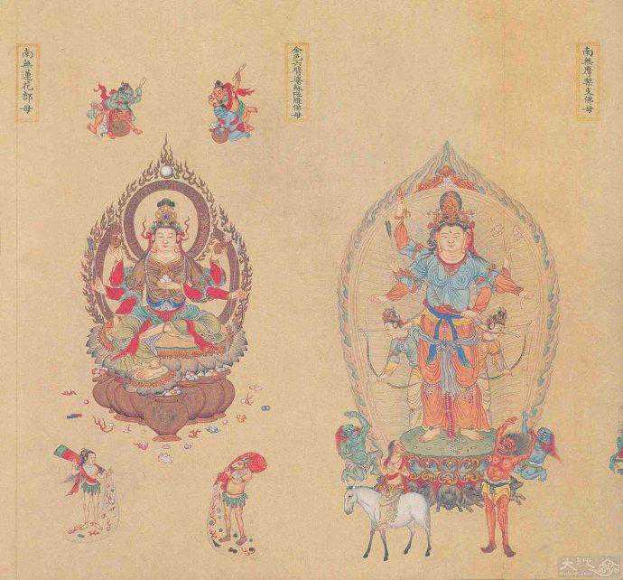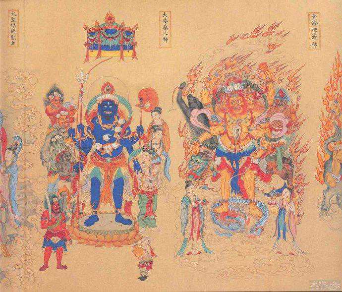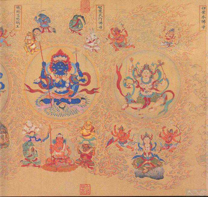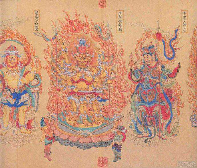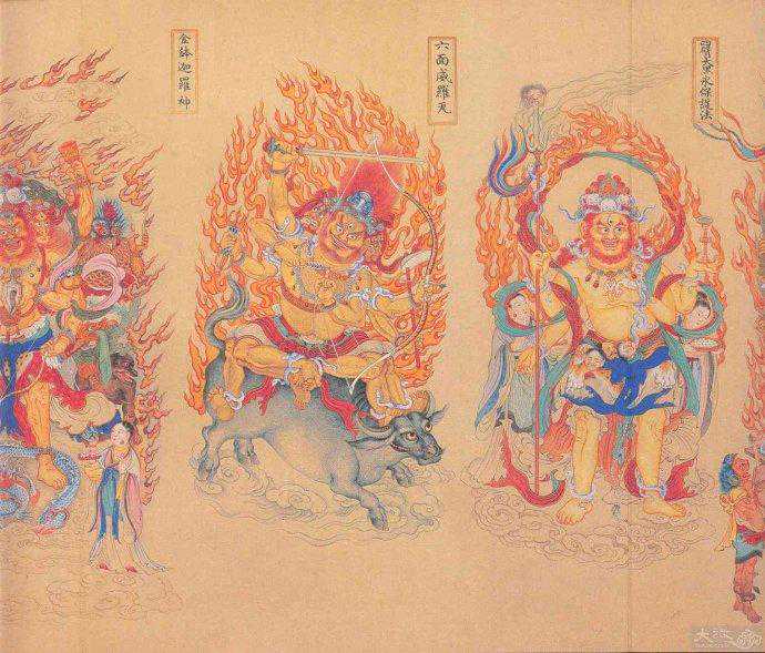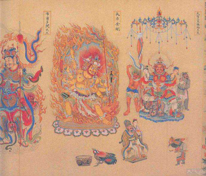 由大圣三界转轮王众至守护摩鋶首罗众,画的都是护法神像,并多属密宗系列。神像中,除了大圣福德龙女和白叶衣佛母是面容慈祥和悦外,其余都是手持兵刃、凶狠威猛,不少是金刚和蓝身,以人头、骷髅作装身饰物,借此警醒世人生死无常。