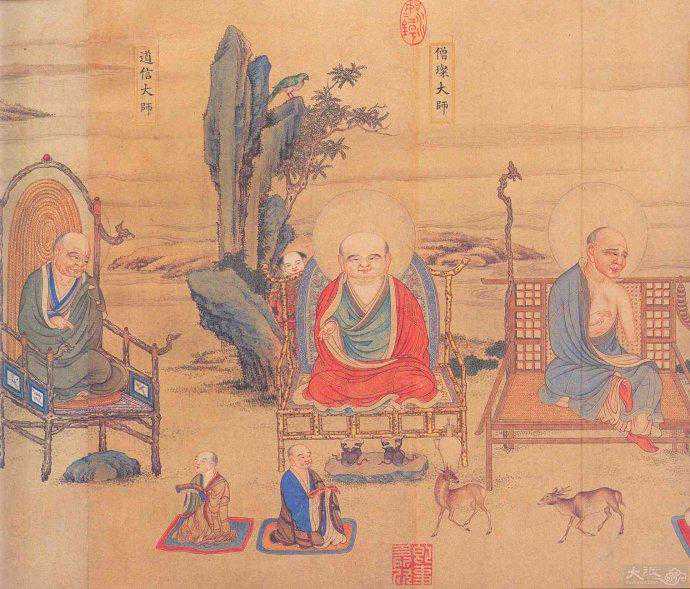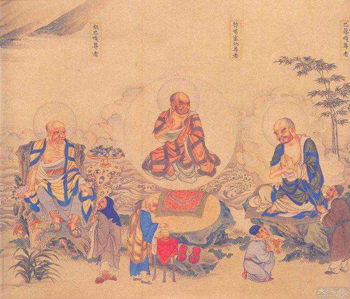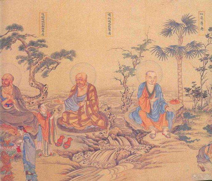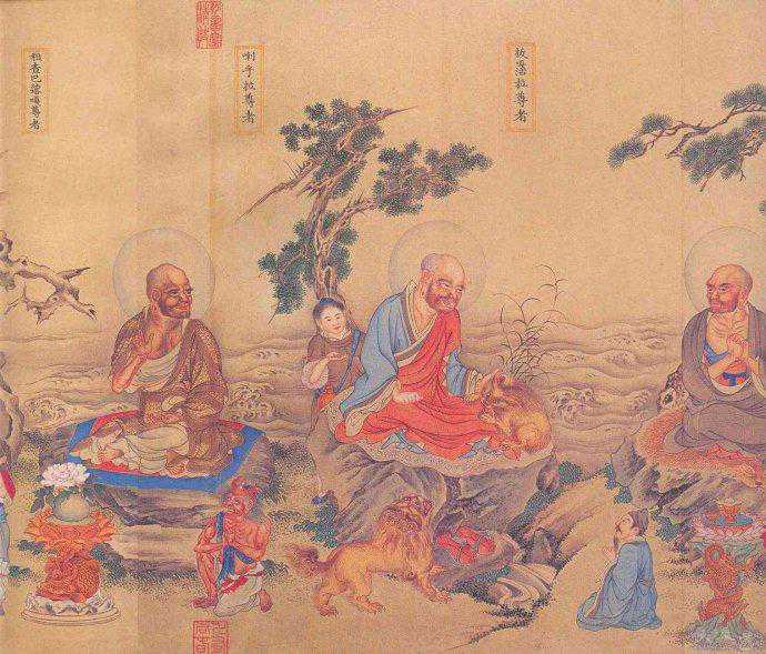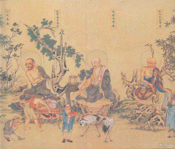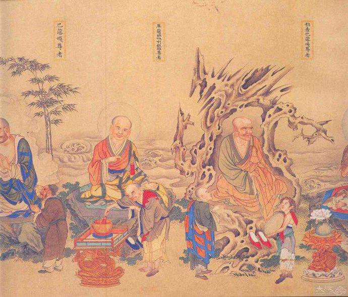 由阿机达尊者至尊者阿难,画的都是尊者罗汉。“十六应真”加上佛的两大弟子迦叶和阿难,成为十八罗汉。这部分应该是画家最得心应手的杰作,把各位罗汉不同的身份、面貌、气质、性格和心理状况都描绘得惟妙惟肖,又把本来孤立的个体神像,放在统一的自然环境里,以山水树石连接,使画面浑然一体。