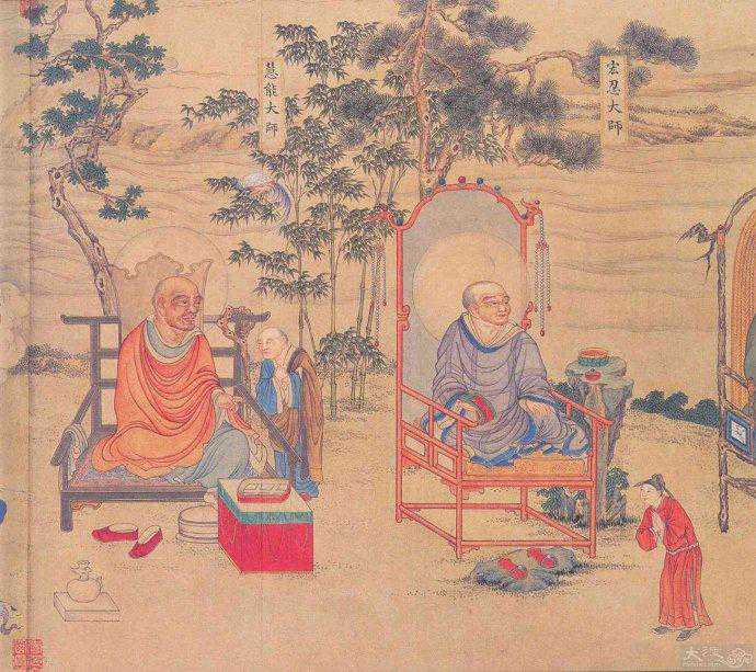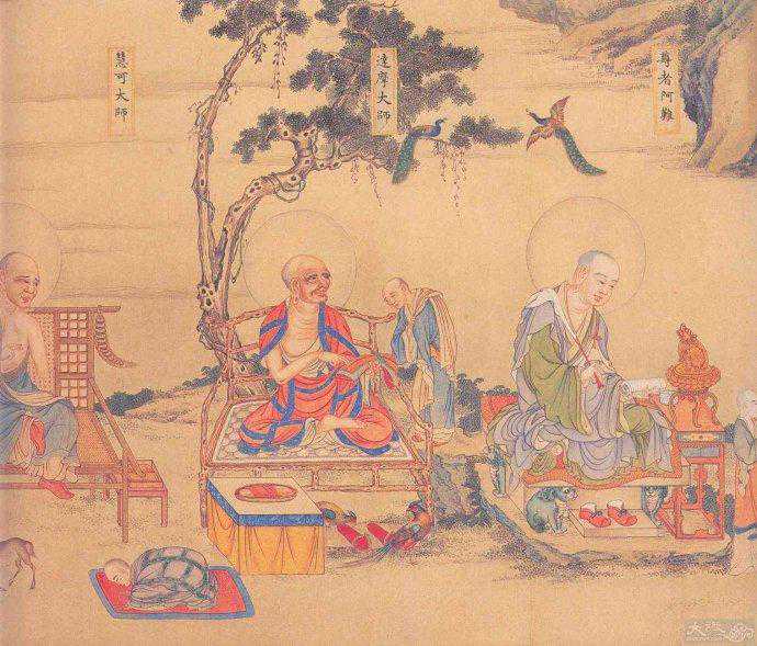 由达摩祖师至慧能祖师共六幅。中国禅宗派别的首脑人物,相传如来佛以心印嘱咐迦叶为禅宗初祖,二十八世传至达摩,来中国成为东土始祖。后来衣钵相传,由二祖慧可传至六祖慧能。慧能的禅宗大行于南方,成为南宗。画家把六位大师同置在一个宁静的自然环境,山峦平远,湖水开阔,更彰显众大师的深厚修为和智慧。图中的达摩大师作梵像,深目高鼻、面相清瘦。而慧可大师则左臂折断——起因是当年达摩高居嵩山少林寺,慧可向他学法,为表虔诚之心,曾把左臂砍掉。