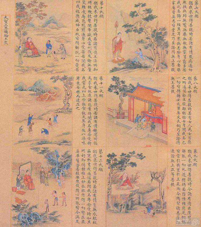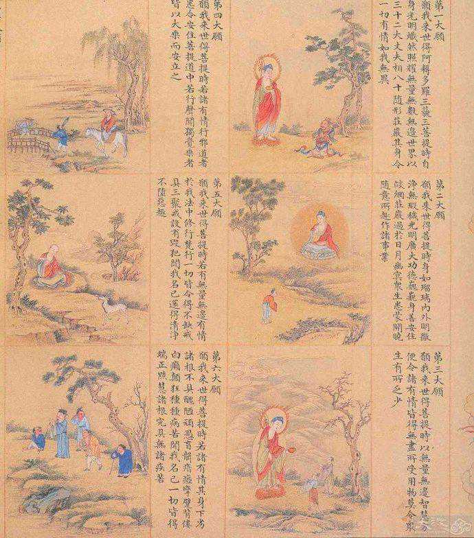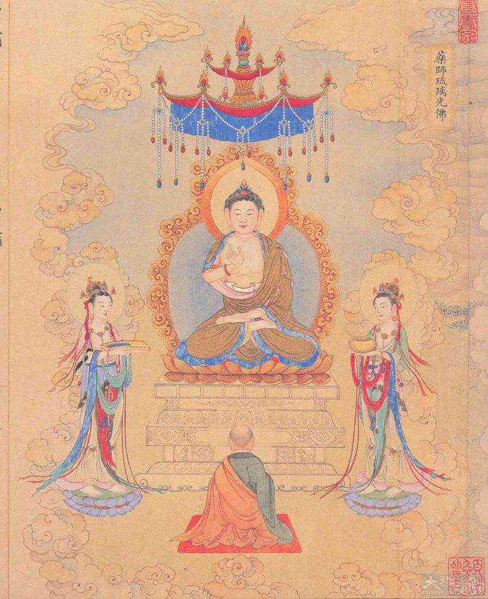由药师琉璃光佛会、药师琉璃光佛及其十二大愿三幅图组成,是本画卷另一个高潮。在药师琉璃光佛会里,由四十余位神众聚会于菩提树下,药师如来佛端坐在正中须弥座上,右手作安慰印,左手置在腹前,足踏莲花,背有祥云,头顶放光明,有塔式华盖璎珞。佛两侧倚坐莲座者,左为日光普照菩萨,右为月光遍照菩萨,与中尊佛合称为“药师三尊”。佛前供案两旁有两位跪着的菩萨及二药童子,迦叶、阿难、药师八大菩萨和十二神将等分列两侧,场面浩荡,人物众多,色彩绚丽。药师琉璃光佛及其十二大愿图又是另一种景象。药师佛交脚而坐,左胁侍菩萨双手捧钵、右胁侍菩萨双手持经,身披袈裟的高僧跪拜佛前,显然这是幅药师佛授经图。接着画家以连环画形式,图释药师佛的十二大愿,图文并茂,药师佛在图中反复出现,希望来世得菩提正果时,众生苦难都获得解脱。