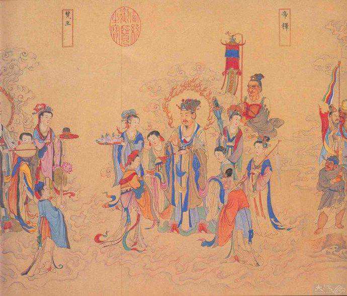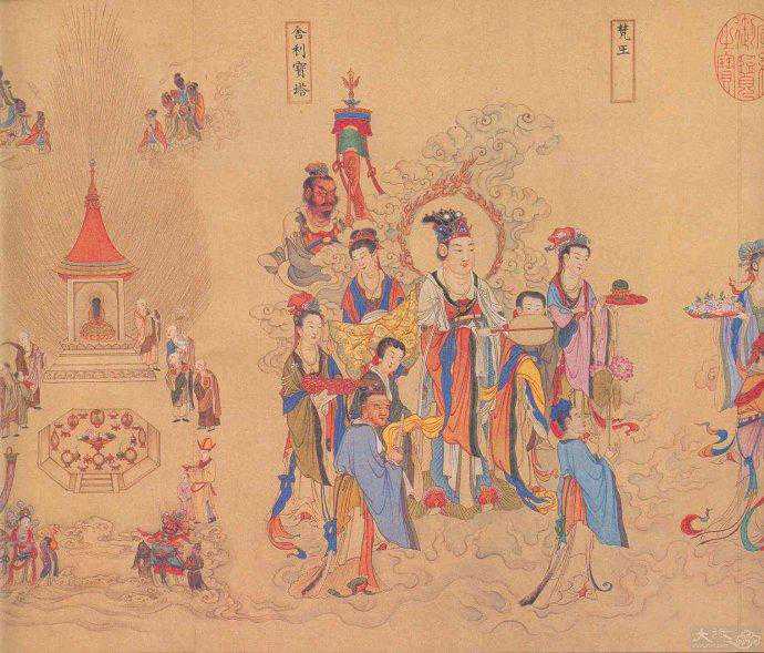 第九部分、帝释、梵王和舍利宝塔帝释和梵王都是诸天神之王,衣冠都作帝王之相,各有侍者八人,宛如相会于云中,中国请问甚浓。舍利宝塔是佛祖释迦牟尼涅槃后安葬其遗体遗物的建筑物,塔下画有祭坛,有许多僧众在顶礼膜拜。全画卷所绘神像亦至此终结。