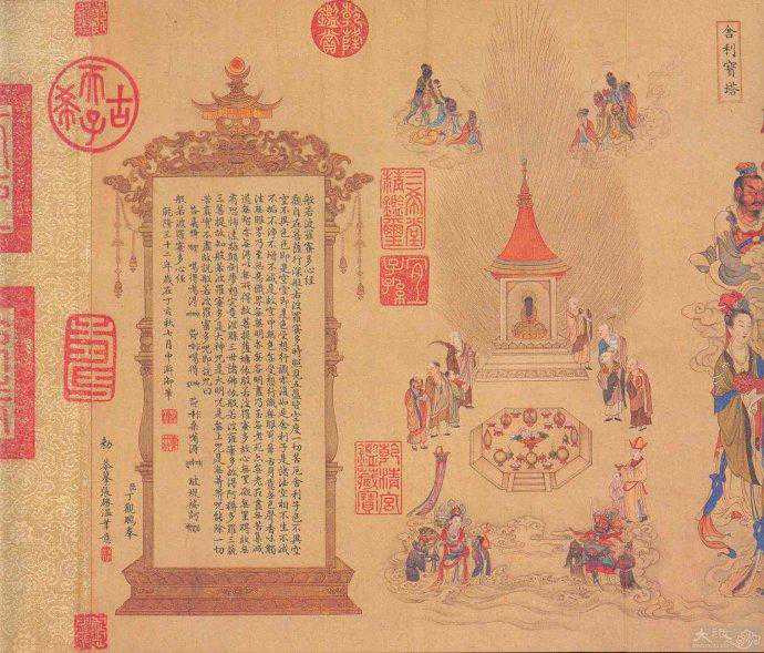 舍利宝塔、心经。卷末。舍利宝塔是佛祖释迦牟尼涅槃后安葬其遗体遗物的建筑物,塔下画有祭坛,有许多僧众在顶礼膜拜。