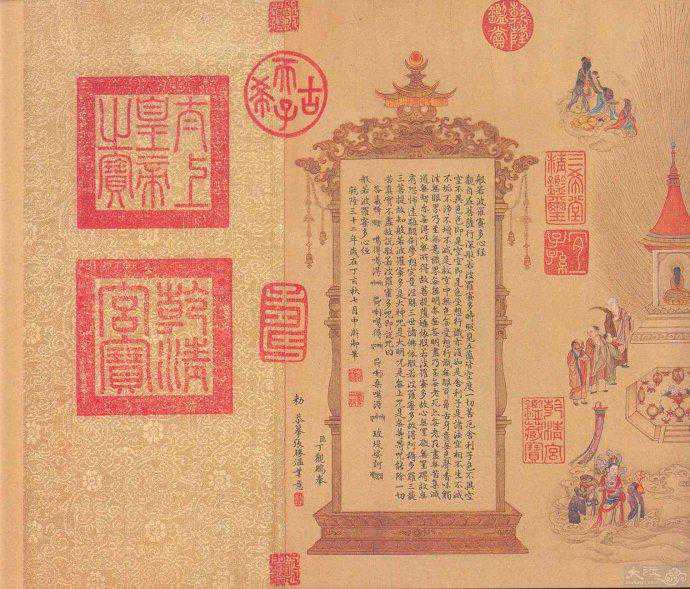 般若波罗蜜多心经:卷末乾隆皇帝亲笔的《般若波罗蜜多心经》,末端款署“臣丁观鹏奉諫恭摹张胜温笔意”作结。
