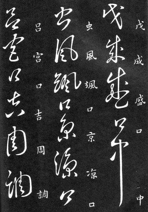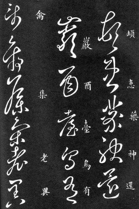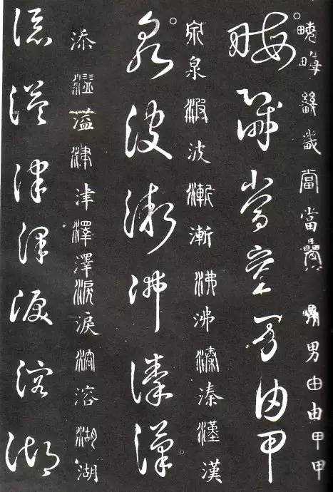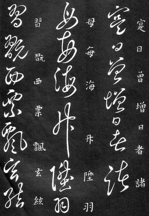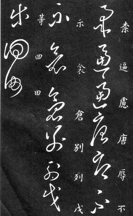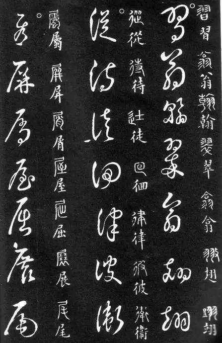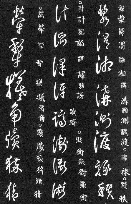 草书在唐代出现了以张旭、怀素为代表的狂草,成为完全脱离实用的艺术创作.狂草亦称大草,笔意奔放,体势连绵,如唐朝张旭《千文断碑》、《古诗四道》,怀素僧《自叙帖》等等,,张旭史称“草圣”,孙过庭《书谱》字字区别,不相连接,而笔意活泼、秀媚。“大草”与“小草”相对称,大草纯用草法,难以辨认,张旭、怀素善此,其字一笔而成,偶有不连,而血脉不断。清朝冯班《钝印书要》谈学草书法云:小草学献之、大草学羲之,狂草学张旭不如学怀素。怀素的草字容易辨认,字迹清瘦见形,字字相连处亦落笔清晰易临。张旭字形变化繁多,常一笔数字,隔行之间气势不断,不易辨认,形成一种独特的风格,韩愈《送高闲上人序》中提到张旭草书以“喜怒窘穷,忧悲愉佚,怨恨、思慕、酣醉、无聊、不平,而有动于心,必于草书挥毫发之”,故学张旭难。