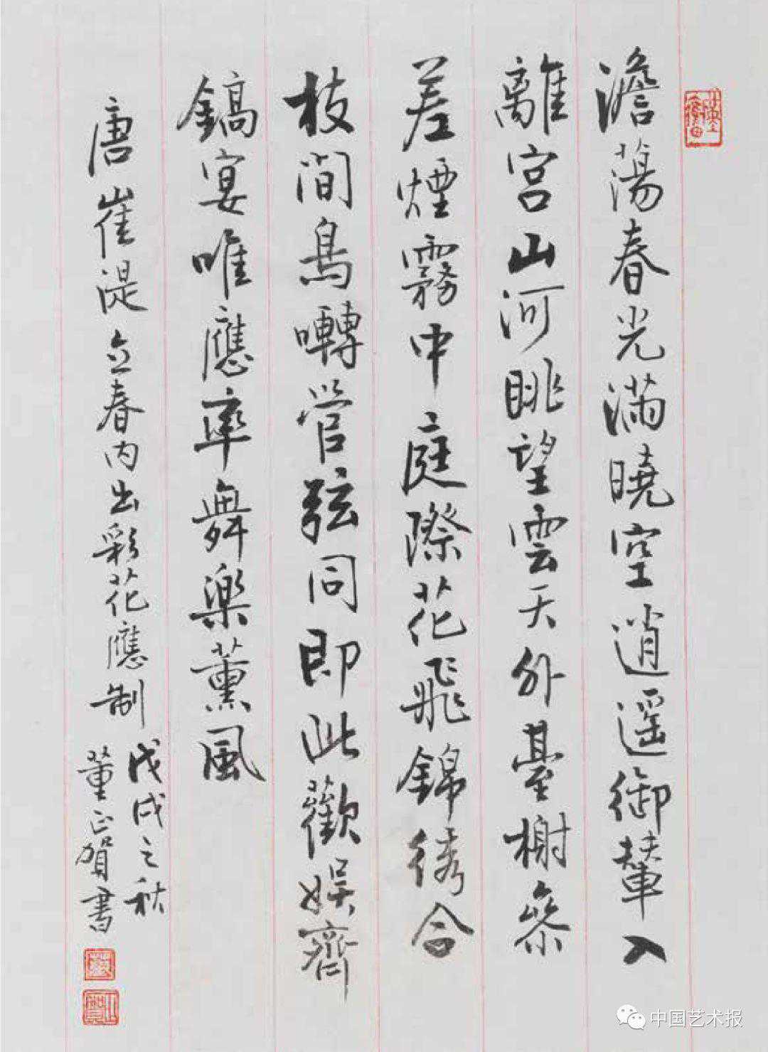 颐和园宝云阁、颐乐殿、排云殿、大戏台、澄怀阁楹联,颐和园玉华殿、仁寿殿、霞芬室匾额,颐和园城关南题额,苏轼、陶渊明、柳宗元、秦观、李清照诗词等等,在展期近一个月的展览中,共展出董正贺的书法作品49幅,涉及楷书、行书等各书体。其笔力遒劲,雍容大气,弥漫着“皇家气派”。