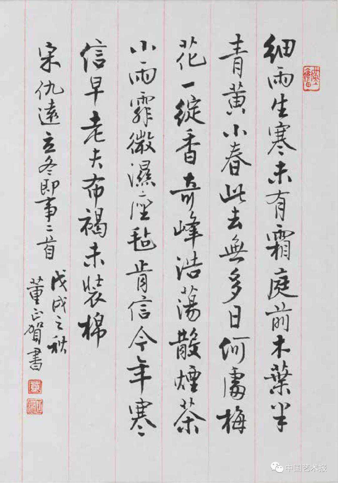 已在故宫博物院工作45年之久的董正贺,是故宫里一位专事写字的书家。1951年,董正贺出生于北京市南池子一个悬壶世家。祖父董玉琨在京城中医圈颇有名气,亦写得一手好字。董正贺说见过祖父以小楷抄写的《药性论》,周正大气,堪比书家。父亲董石良早年供职北京荣宝斋,擅书法、绘画和篆刻,京城老字号“张一元”茶庄、杭州西湖苏堤的“仁风亭”等便出自其父之手。幼承家学的董正贺少时便在父亲“每天写一张大字再出去玩”的严令下日日苦练“童子功”。得益于其父开蒙引导及言传身教,小小年纪的她便在书法艺术上锋芒难掩。