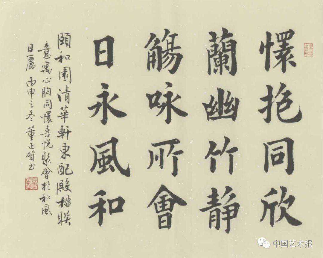 “董正贺的书法植根传统,自成风格,已经成为了故宫的一张文化名片。”正如故宫博物院副院长闫宏彬所言,正大气象、庙堂之气,是人们给董正贺书法最多的评价,而这样的风格也被公认为是最符合故宫气韵的。其实这也正是董正贺执着追求的。“‘庙堂气’是我书法创作的自觉追求,唯如此方可配得上故宫这座辉煌的宝殿。”以欧体楷书名于世的董正贺兼习篆隶行草诸体。得徐之谦、康雍、刘炳森等先生指授,对《九成宫》的研究,长达数十年,近几年尤涉泰山《金刚经》并将其浑朴融于欧字雅正,内化于心、外化于形,终成个人独特风格。业内人以“新古典”誉其书风,恰是其根植中国书法传统精神又勇于创新的见证。