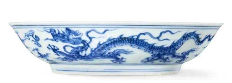 永乐朝半世纪后,成化御窑佳器,秀逸之至,为陶瓷鉴藏家向慕,然私人收藏中才仅二十余件。刘氏藏成化青花盘,器外雅饰云龙,诚当朝雅致罕例。温润的瓷胎、淡雅的青花、柔滑的釉面,尽是成化御窑精妙的证据,无怪为人趋之若鹜。
