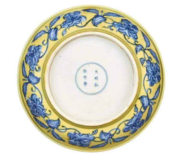 明弘治黄地青花折枝槴子花果纹盘