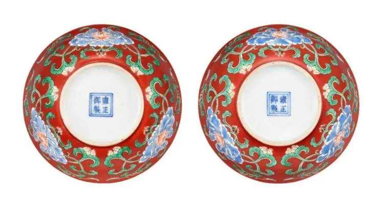 清雍正珊瑚红地五彩折枝花卉纹浅碗一对