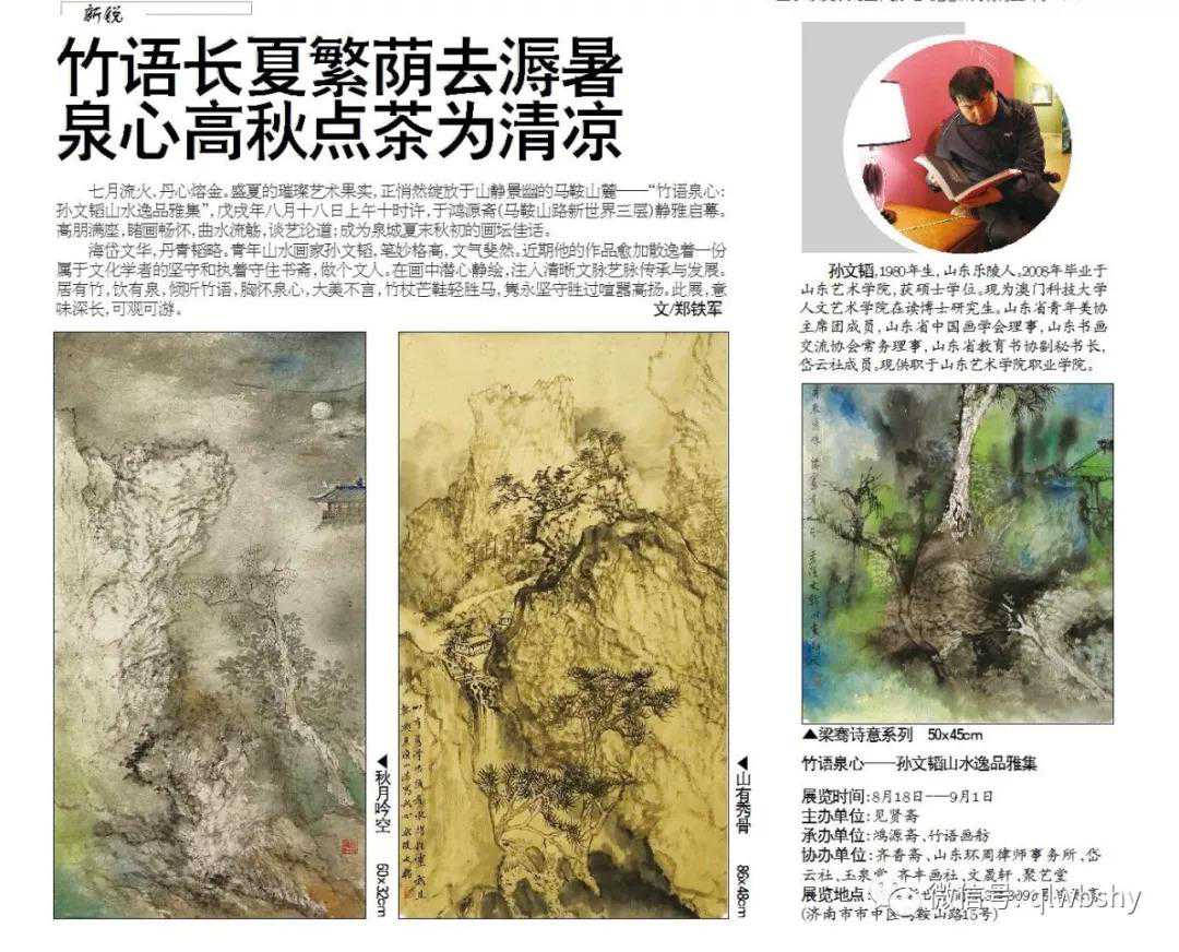 海岱文华,丹青韬略。青年山水画家孙文韬,笔妙格高,文气斐然。近期他的作品愈加散逸着一份属于文化学者的坚守和执着——守住书斋,做个文人。在画中潜心静绘,注入清晰文脉艺脉传承与发展。居有竹,饮有泉,倾听竹语,胸怀泉心,大美不言,竹杖芒鞋轻胜马,隽永坚守胜过喧嚣高扬。此展,意味深长,可观可游。